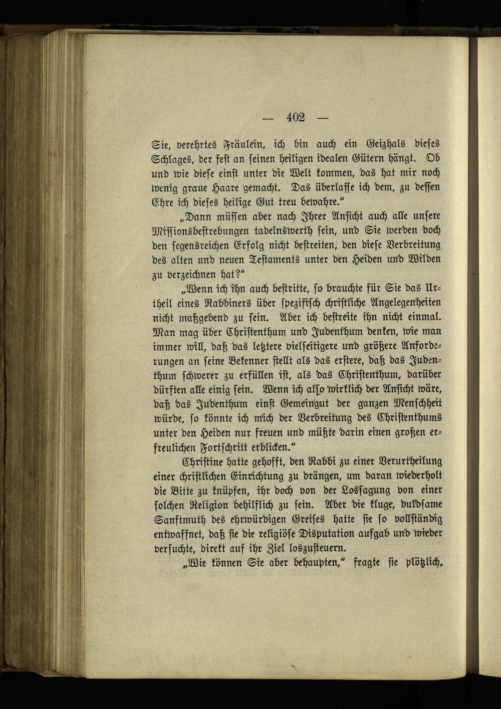 „Wenn ich ihn auch bestritte, so brauchte für Sie das Ur- theil eines Rabbiners über spezifisch christliche Angelegenheiten nicht maßgebend zu sein. Aber ich bestreite ihn nicht einmal. Man mag über Christenthum und Judenthum denken, wie man immer will, daß das letztere vielseitigere und größere Anforderungen an seine Bekenner stellt als das erster«, daß das Judenthum schwerer zu erfüllen ist, als das Christenthum, darüber dürften alle einig sein. Wenn ich also wirklich der Ansicht wäre, daß das Judenthum einst Gemeingut der ganzen Menschheit würde, so könnte ich mich der Verbreitung des Christenthums unter den Heiden nur freuen und müßte darin einen großen erfreulichen Fortschritt erblicken."