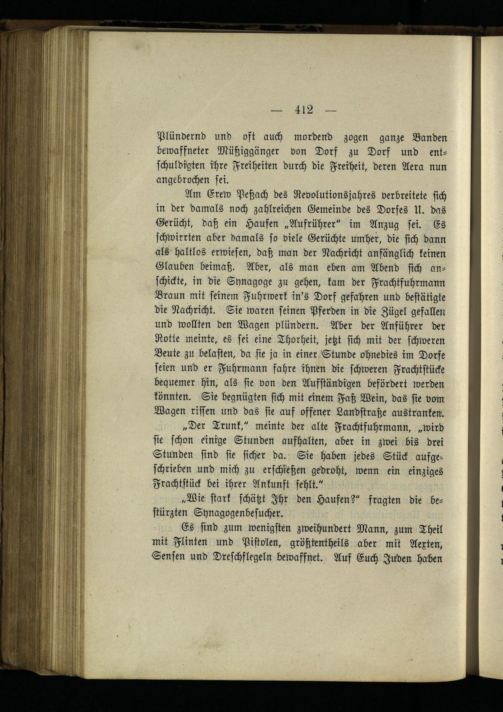 Am Ere'w Peßach des Revolutionsjahres verbreitete sich in der damals noch zahlreichen Gemeinde des Dorfes U. das Gerücht, daß ein Hausen „Ausrührer" im Anzug sei. Es schwirrten aber damals so viele Gerüchte umher, die sich dann als haltlos erwiesen, daß man der Nachricht anfänglich keinen Glauben beimaß. Aber, als man eben am Abend sich anschickte, in die Synagoge zu gehen, kam der Frachtsuhrmann Braun mit feinem Fuhrwerk in's Dorf gefahren und bestätigte die Nachricht. Sie waren seinen Pferden in die Zügel gefallen und wollten den Wagen plündern. Mer der Anführer der Rotte meinte, es sei eine Thorheit, jetzt sich mit der schweren Beute zu belasten, da sie ja in einer Stunde ohnedies im Dorfe seien und er Fuhrmann fahre ihnen die schweren Frachtstücke bequemer hin, als sie von den Ausständigen befördert werden könnten. Sie begnügten sich mit einem Faß Wein, das sie vom Wagen rissen und das sie auf offener Landstraße austranken.