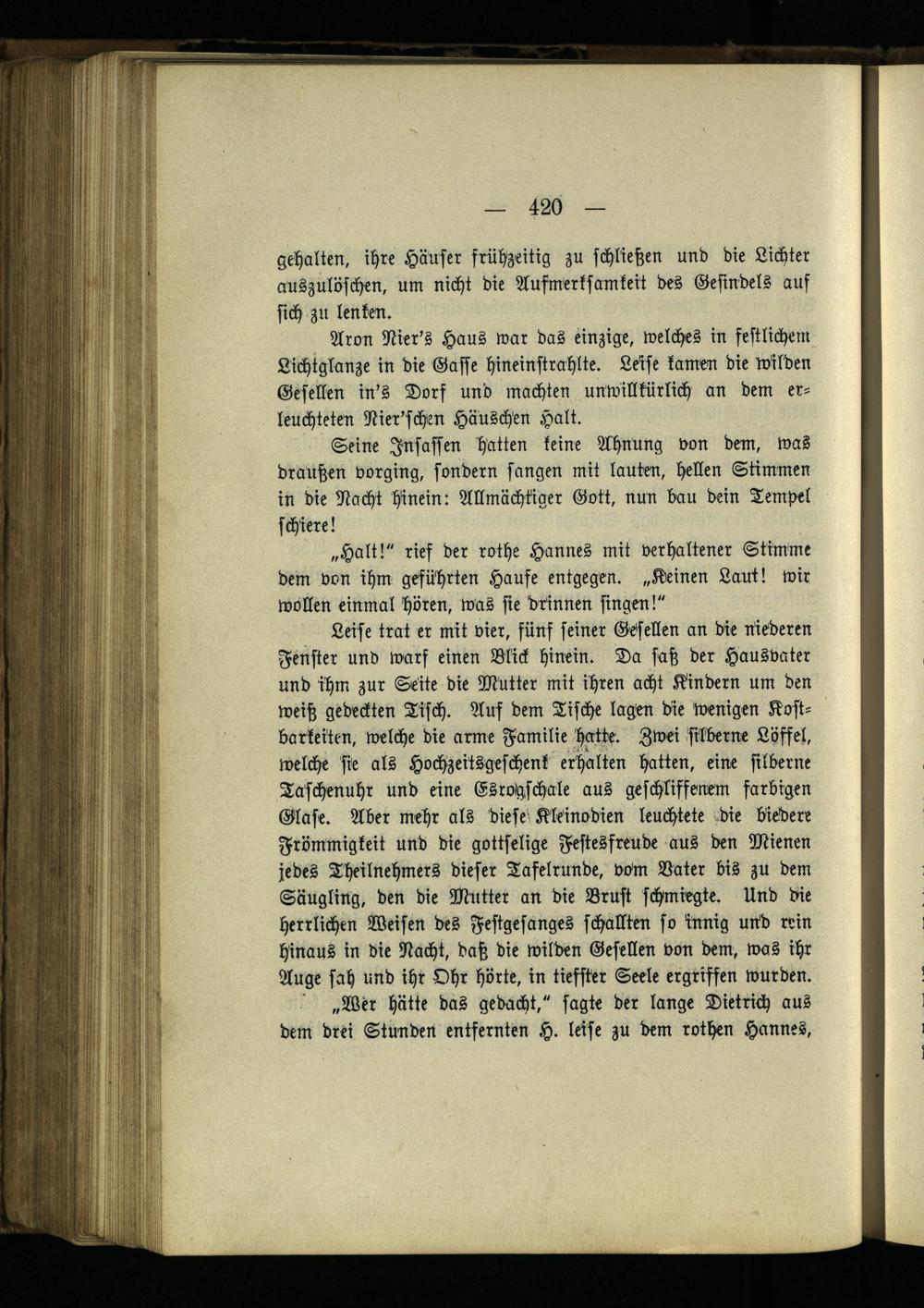 Leise trat er mit vier, fünf seiner Gesellen an die niederen Fenster und warf einen Blick hinein. Da saß der Hausvater und ihm zur Seite die Mutter mit ihren acht Kindern um den weiß gedeckten Tisch. Aus dem Tische lagen die wenigen Kostbarkeiten, welche die arme Familie hatte. Zwei silberne Löffel, welche sie als Hochzeitsgeschenk erhalten hatten, eine silberne Taschenuhr und eine Esrotzschale aus geschlissenem farbigen Glase. Aber mehr als diese Kleinodien leuchtete die biedere Frömmigkeit und die gottselige Festesfreude aus den Mienen jedes Theilnehmers dieser Tafelrunde, vom Vater bis zu dem Säugling, den die Mutter an die Brust schmiegte. Und die herrlichen Weisen des Festgesanges schallten so innig und rein hinaus in die Nacht, daß die wilden Gesellen von dem, was ihr Auge sah und ihr Ohr hörte, in tiefster Seele ergriffen wurden.