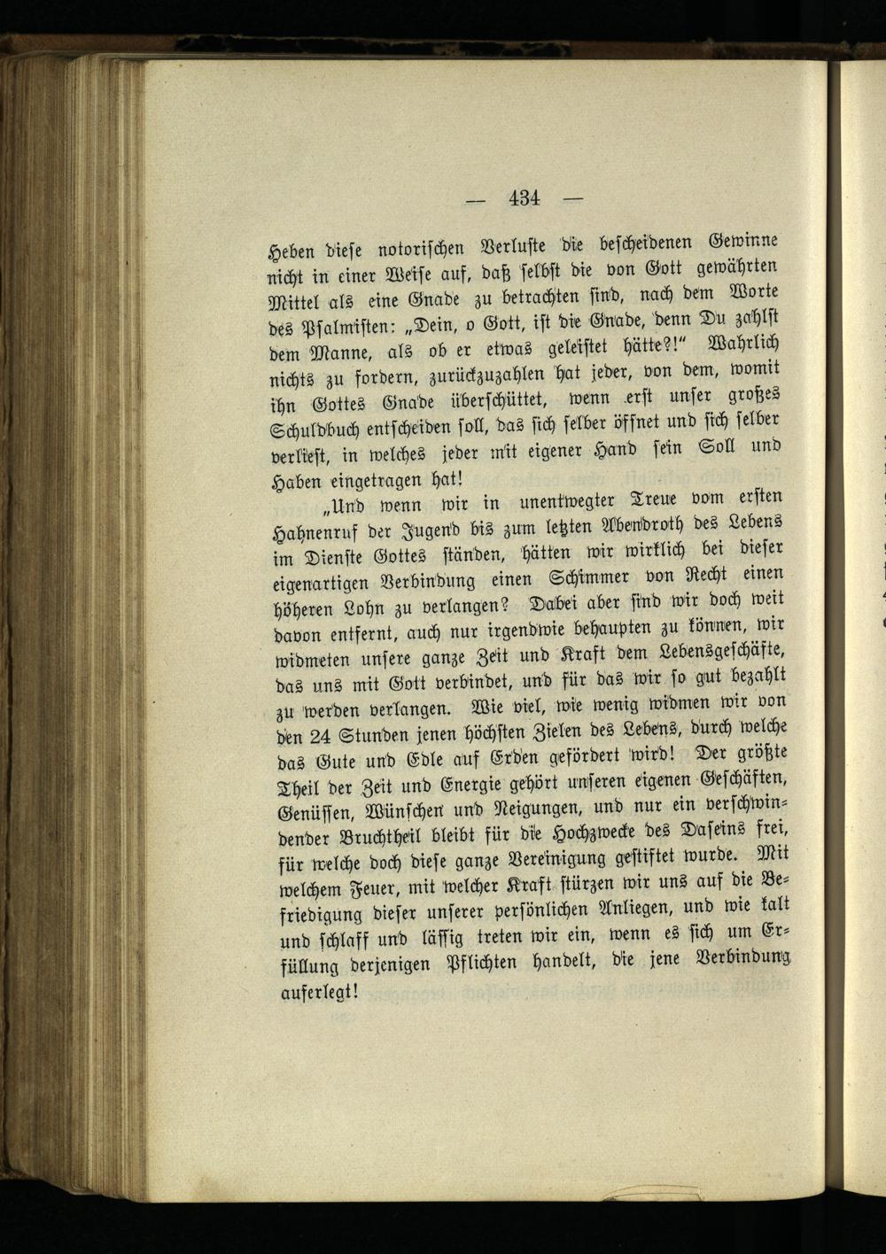 „Und wenn wir in unentwegter Treue vom ersten Hahnenruf der Jugend bis zum letzten Abendroth des Lebens im Dienste Gottes ständen, hätten wir wirklich bei dieser eigenartigen Verbindung einen Schimmer von Recht einen höheren Lohn zu verlangen? Dabei aber sind wir doch weit davon entfernt, auch nur irgendwie behaupten zu können, wir widmeten unsere ganze Zeit und Kraft dem Lebensgeschäfte, das uns mit Gott verbindet, und für das wir so gut bezahlt zu werden verlangen. Wie viel, wie wenig widmen wir von den 24 Stunden jenen höchsten Zielen des Lebens, durch welche das Gute und Edle auf Erden gefördert wird! Der größte Theil der Zeit und Energie gehört unseren eigenen Geschäften, Genüssen, Wünschen und Neigungen, und nur ein verschwindender Bruchtheil bleibt für die Hochzwecke des Daseins frei, für welche doch diese ganze Vereinigung gestiftet wurde. Mit welchem Feuer, mit welcher Kraft stürzen wir uns auf die Befriedigung dieser unserer persönlichen Anliegen, und wie kalt und schlaff und lässig treten wir ein, wenn es sich um Erfüllung derjenigen Pflichten handelt, die jene Verbindung auferlegt!