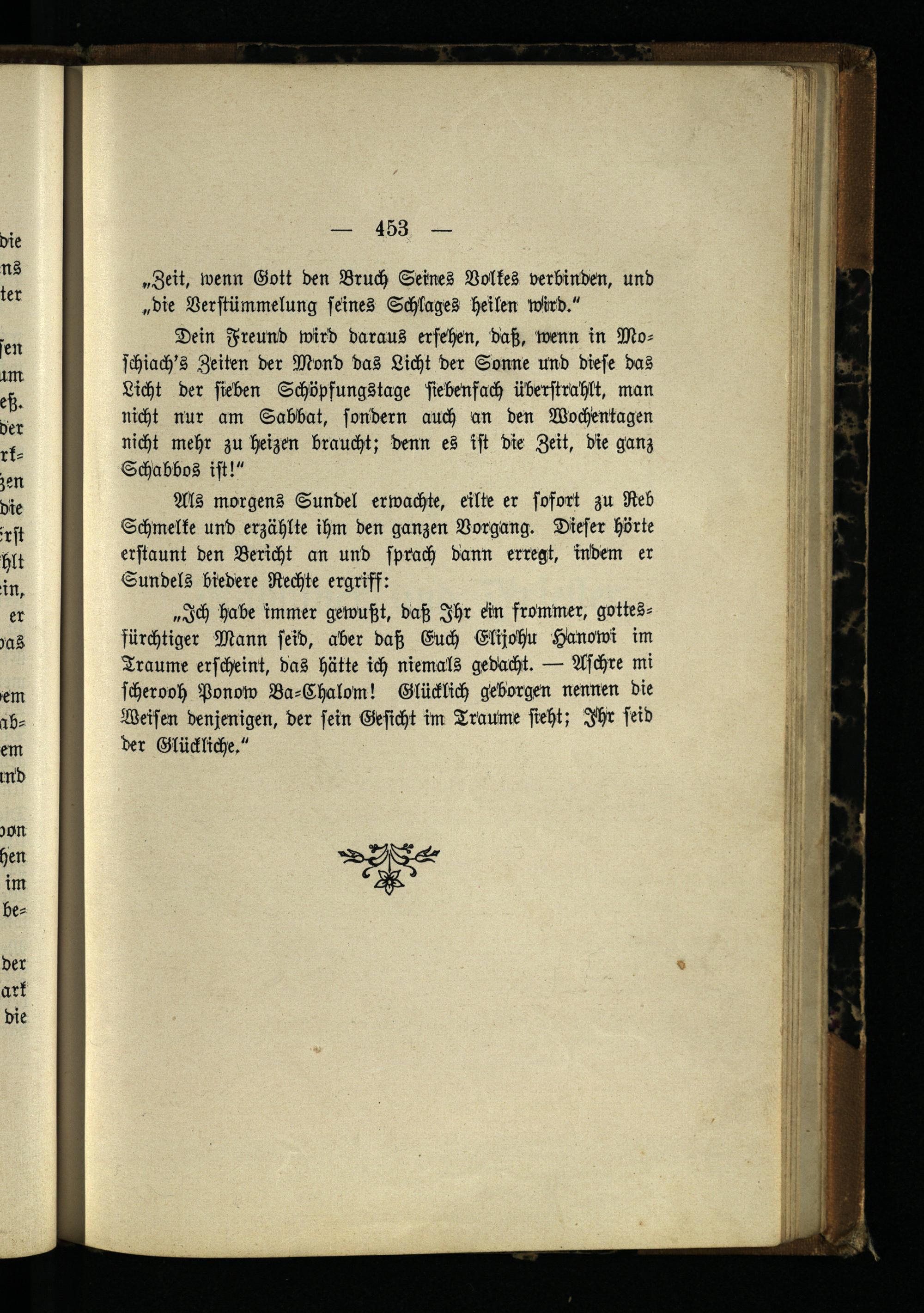 „Ich habe immer gewußt, daß Ihr ein frommer, gottes- fiirchtiger Mann seid, aber daß Euch Elijohu HaNowi im Traume erscheint, das hätte ich niemals gedacht. — Aschre mi scherooh Ponow Ba-Chalom! Glücklich geborgen nennen die Weisen denjenigen, der sein Gesicht im TrauMe sieht; Ihr seid der Glückliche."
