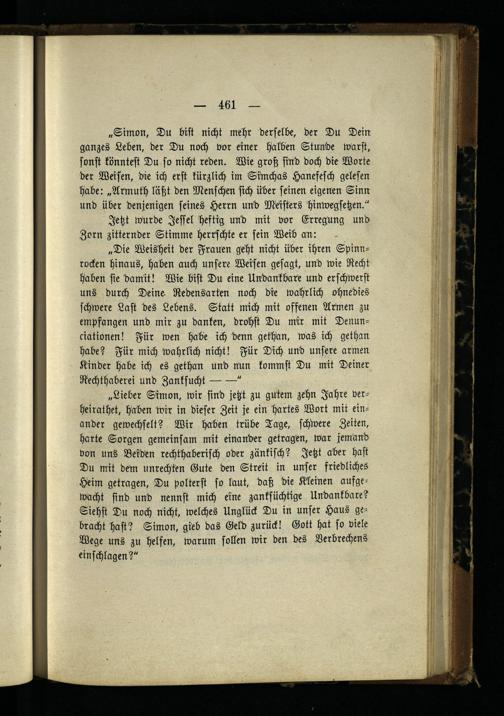 „Simon, Du bist nicht mehr derselbe, der Du Dein ganzes Leben, der Du noch vor einer halben Stunde märst, sonst könntest Du so nicht reden. Wie groß sind doch die Worte der Weisen, die ich erst kürzlich im Siinchas Hanesesch gelesen habe: „Armuth läßt den Menschen sich über seinen eigenen Sinn und über denjenigen seines Herrn und Meisters hinwegsetzen.''
