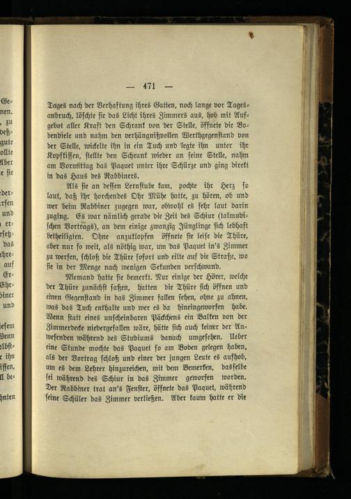 Tages nach der Verhaftung ihres Gatten, noch lange vor Tagesanbruch, löschte sie das Licht ihres Zimmers aus, hob mit Aufgebot aller Kraft den Schrank von der Stelle, öffnete die Bodendiele und nahm den verhängnißöollen Werthgegenstand von der Stelle, wickelte ihn in ein Tuch und legte ihn unter ihr Kopfkissen, stellte den Schrank wieder an seine Stelle, nahm am Vormittag das Paquet unter ihre Schurze und ging direkt in das Haus des Rabbiners.
