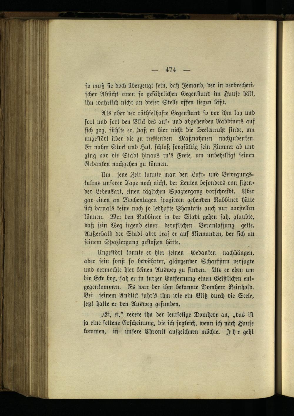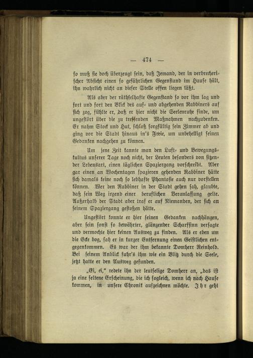 Als aber der räthselhafte Gegenstand so vor ihm lag und fort und fort den Blick des auf- und abgehenden Rabbiners auf sich zog, fühlte er, baß er hier nicht die Seelenruhe finde, um ungestört Uber die zu treffenden Maßnahmen nächzudenken. Er nahm Stock und Hut, schloß sorgfältig sein Zimmer ab und ging vor die Stadt hinaus in's Freie, um unbehelligt seinen Gedanken nachgehen zu können.