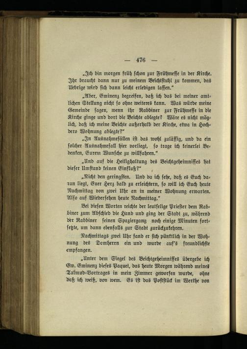 „Aber, Eminenz begreifen, daß ich das bei meiner amtlichen Stellung nicht so ohne weiteres kann. Was würde meine Gemeinde sagen, wenn ihr Rabbiner zur Frühmesse in die Kirche ginge und dort die Beichte ablegte? Wäre es nicht möglich, daß ich meine Beichte außerhalb der Kirche, etwa in Hoch- dero Wohnung ablegte?"