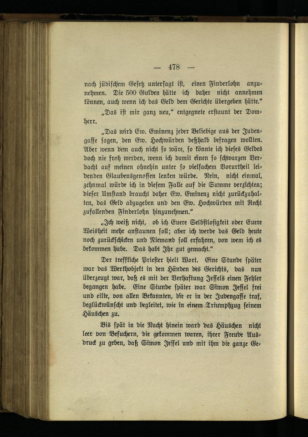 Der treffliche Priester hielt Wort. Eine Stunde später war das Werthobjekt in den Händen des Gerichts, das nun überzeugt war, daß es mit der Verhaftung Jessels einen Fehler begangen habe. Eine Stunde später war Simon Jeffel frei und eilte, von allen Bekannten, die er in der Judengaffe traf, beglückwünscht und begleitet, wie in einem TriUinphzug seinem Häuschen zu.
