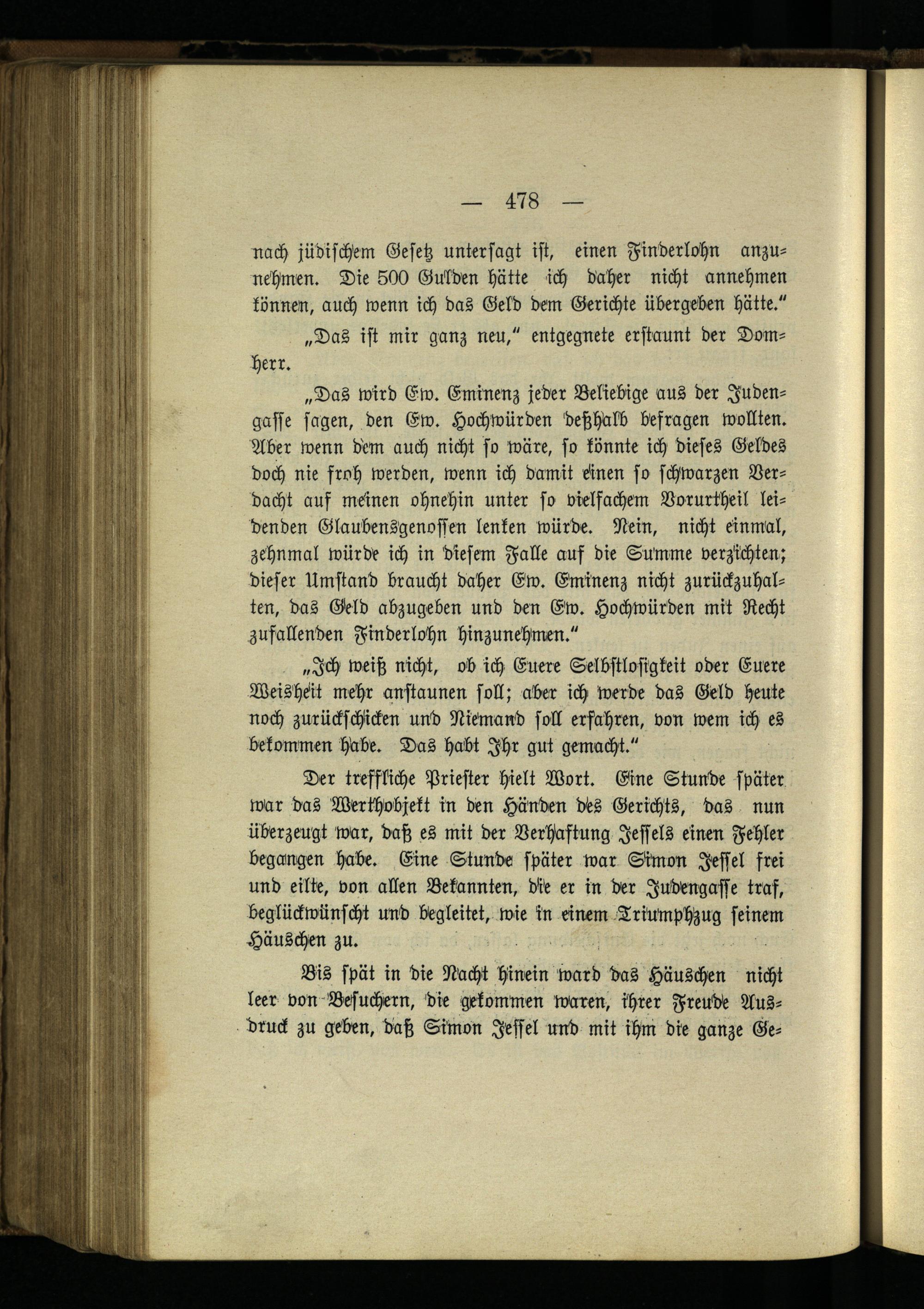 „Das wird Ew. Eminenz jeder Beliebige aus der Judengasse sagen, den Ew. Hochwürden deßhalb befragen wollten. Aber wenn dem auch nicht so wäre, so könnte ich dieses Geldes doch nie froh werden, wenn ich damit einen so schwarzen Verdacht auf meinen ohnehin unter so vielfachem Vorurtheil leidenden Glaubensgenoffen lenken würde. Nein, nicht einmal, zehnmal würde ich in diesem Falle auf die Summe verzichten; dieser Umstand braucht daher Ew. Eininenz nicht zurückzuhalten, das Geld abzugeben und den Ew. Hochwürden mit Recht zufallenden Finderlohn hinzunehmen."
