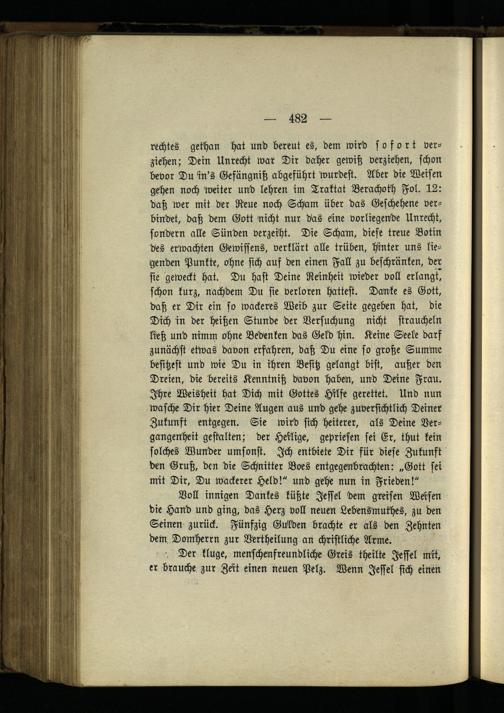 rechtes gethan hat und bereut es, dem wird sofort verziehen; Dein Unrecht war Dir daher gewiß verziehen, schon bevor Du in's Gefängniß abgeführt wurdest. Aber die Weisen gehen noch weiter und lehren im Traktat Berachoth Fol. 12: daß wer mit der Reue noch Scham über das Geschehene verbindet, daß dem Gott nicht nur das eine vorliegende Unrecht, sondern alle Sünden verzeiht. Die Scham, diese treue Botin des erwachten Gewissens, verklärt alle trüben, hinter uns liegenden Punkte, ohne sich auf den einen Fall zu beschränken, der sie geweckt hat. Du hast Deine Reinheit wieder voll erlangt, schon kurz, nachdem Du sie verloren hattest. Danke es Gott, daß er Dir ein so wackeres Weib zur Seite gegeben hat, die Dich in der heißen Stunde der Versuchung nicht straucheln ließ und nimm ohne Bedenken das Geld hin. Keine Seele darf zunächst etwas davon erfahren, daß Du eine so große Summe besitzest und wie Du in ihren Besitz gelangt bist, außer den Dreien, die bereits Kenntniß davon haben, und Deine Frau. Ihre Weisheit hat Dich mit Gottes Hilfe gerettet. Und nun wasche Dir hier Deine Augen aus und gehe zuversichtlich Deiner Zukunft entgegen. Sie wird sich heiterer, als Deine Vergangenheit gestalten; der Heilige, gepriesen sei Er, thut kein solches Wunder umsonst. Ich entbiete Dir für diese Zukunft den Gruß, den die Schnitter Boes entgegenbrachten: „Gott sei mit Dir, Du wackerer Held!" und gehe nun in Frieden!"