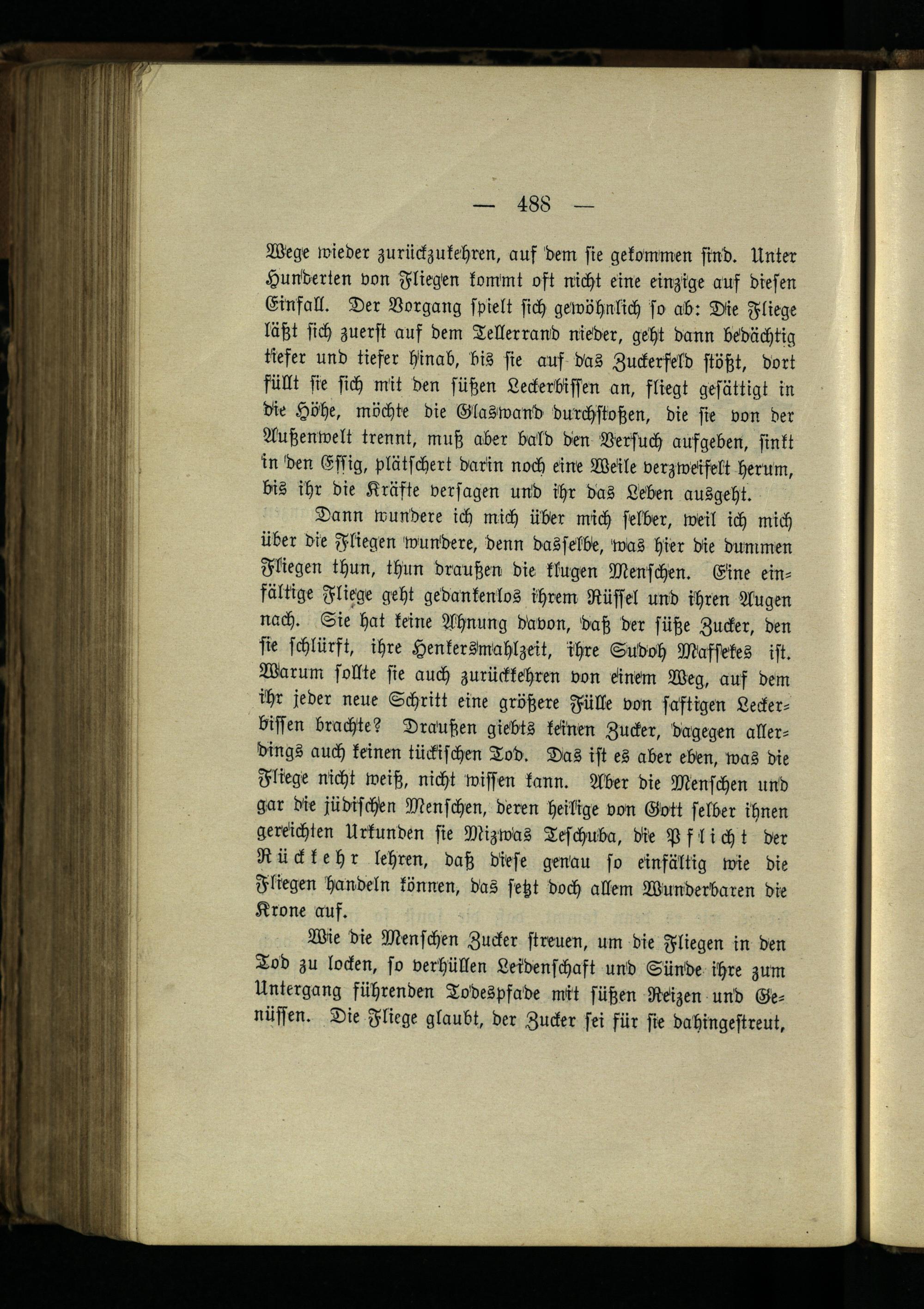 Dann wundere ich mich über mich selber, weil ich mich über die Fliegen wundere, denn dasselbe, was hier die dummen Fliegen thun, thun draußen die klugen Menschen. Eine einfältige Fliege geht gedankenlos ihrem Rüssel und ihren Augen nach. Sie hat keine Ahnung davon, daß der süße Zucker, den sie schlürft, ihre Henkersmahlzeit, ihre Südoh Masfekes ist. Warum sollte sie auch zurückkehren von einem Weg, auf dem ihr jeder neue Schritt eine größere Fülle von saftigen Leckerbissen brachte? Draußen giebts keinen Zucker, dagegen allerdings auch keinen tückischen Tod. Das ist es aber eben, was die Fliege nicht weiß, nicht wissen kann. Aber die Menschen und gar die jüdischen Menschen, deren heilige von Gott selber ihnen gereichten Urkunden sie Mizwas Teschuba, die Pflicht der Rückkehr lehren, daß diese genau so einfältig wie die Fliegen handeln können, das fetzt doch allem Wunderbaren die Krone auf.
