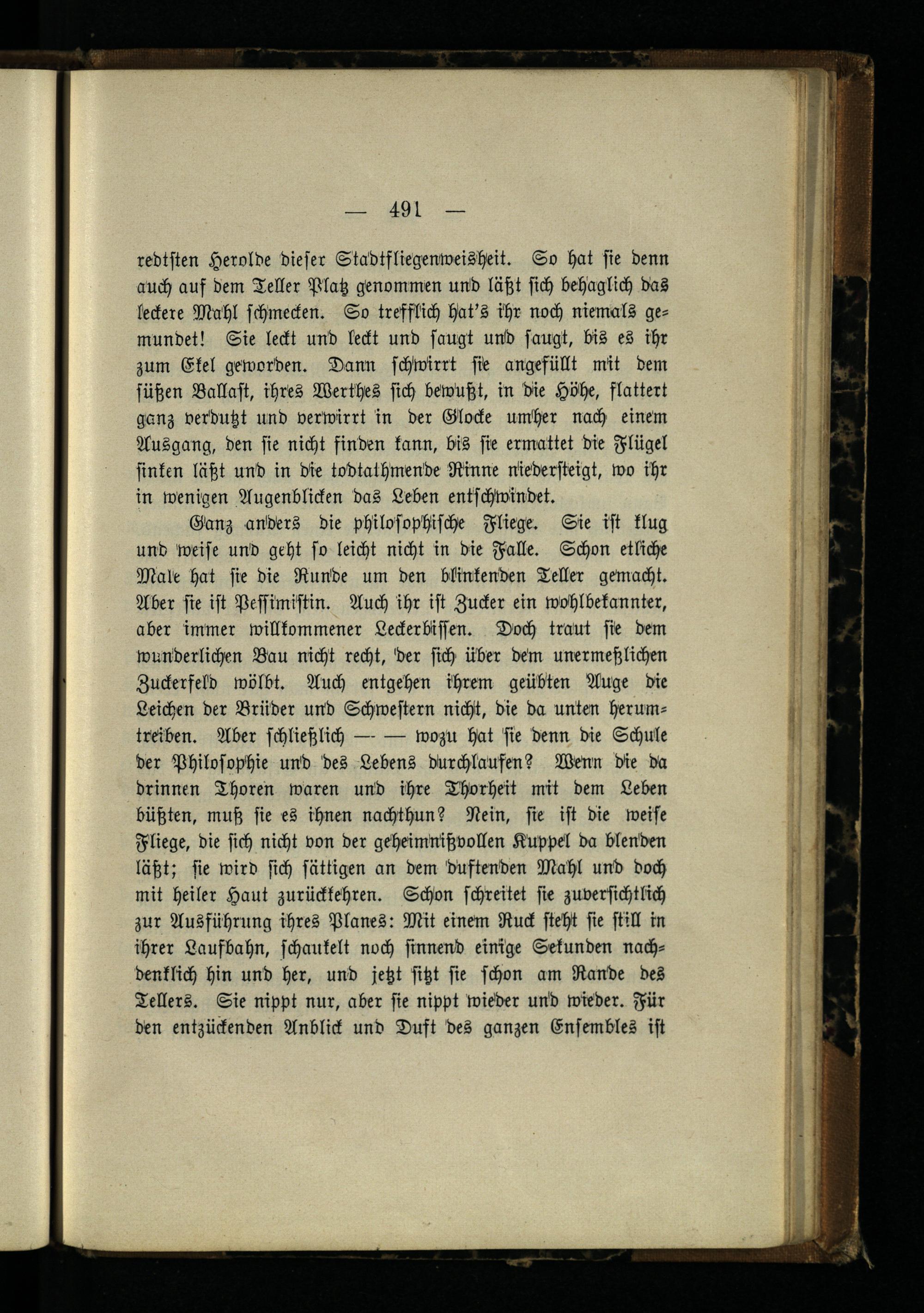 redtsten Herolde dieser Stadtfliegenweisheit. So hat sie denn auch auf dem Teller Platz genommen urid läßt sich behaglich das leckere Mahl schmecken. So trefflich hat's ihr noch niemals gemundet! Sie leckt und leckt und saugt und saugt, bis es ihr zum Ekel geworden. Dann schwirrt sie angefüllt mit dem süßen Ballast, ihres Werthes sich bewußt, in die Höhe, flattert ganz verdutzt und verwirrt in der Glocke umher nach einem Ausgang, den sie nicht finden kann, bis sie ermattet die Flügel sinken läßt und in die todtathmende Rinne niedersteigt, wo ihr in wenigen Augenblicken das Leben entschwindet.