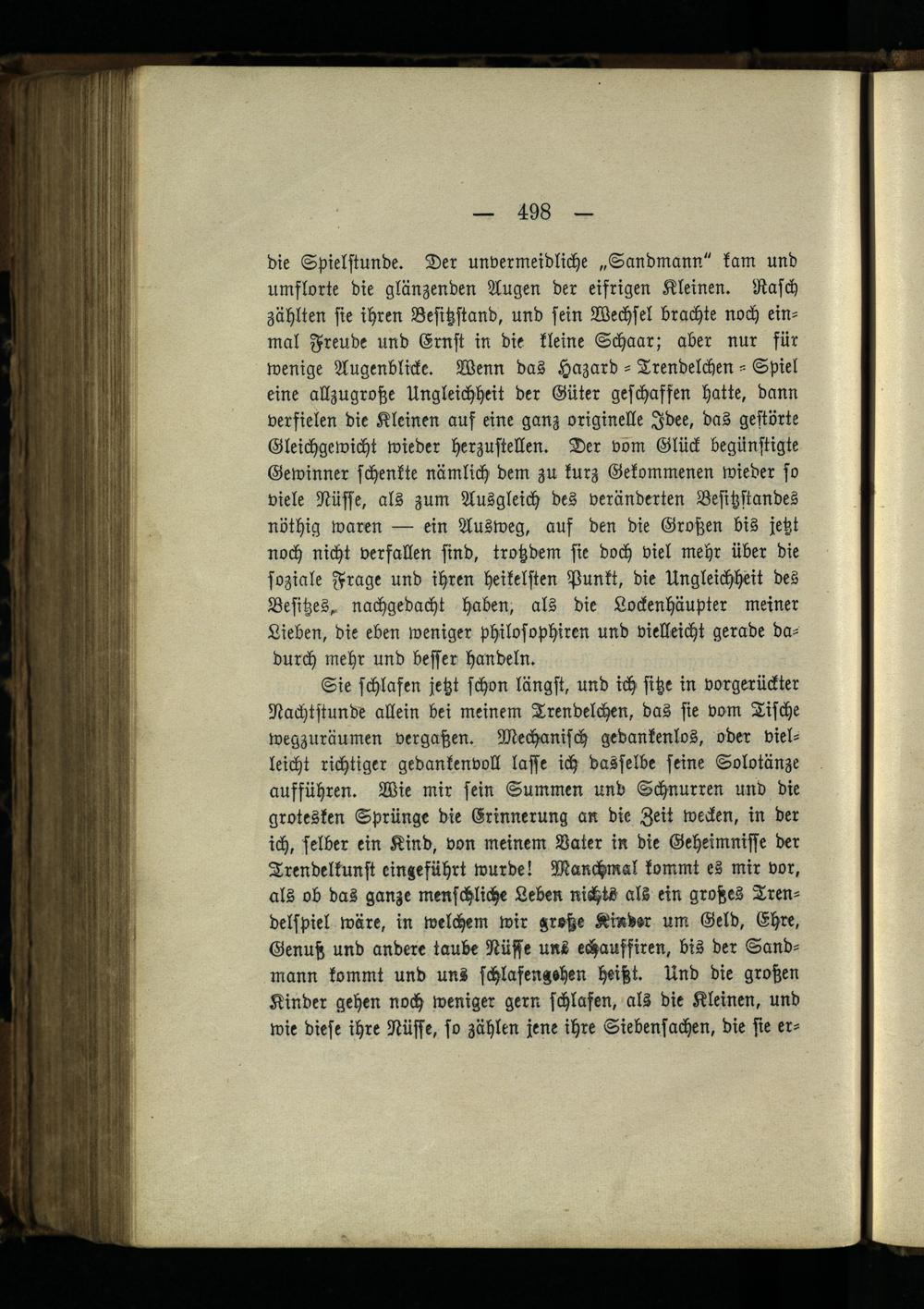Sie schlafen jetzt schon längst, und ich sitze in vorgerückter Nachtstunde allein bei meinem Trendelchen, das sie vom Tische wegzuräumen vergaßen. Mechanisch gedankenlos, oder vielleicht richtiger gedankenvoll lasse ich dasselbe seine Solotänze aufführen. Wie mir sein Summen und Schnurren und die grotesken Sprünge die Erinnerung an die Zeit wecken, in der ich, selber ein Kind, von meinem Vater in die Geheimnisse der Trendelkunst cinzeführt wurde! Manchmal kommt es mir vor, als ob das ganze menschliche Leben nichts als ein großes Trendelspiel wäre, in welchem wir große Kmdrr um Geld, Ehre, Genuß und andere taube Nüsse uns echauffiren, bis der Sandmann kommt und uns schlasengshen heißt. Und die großen Kinder gehen noch weniger gern schlafen, als die Kleinen, und wie diese ihre Nüsse, so zählen jene ihre Siebensachen, die sie er-