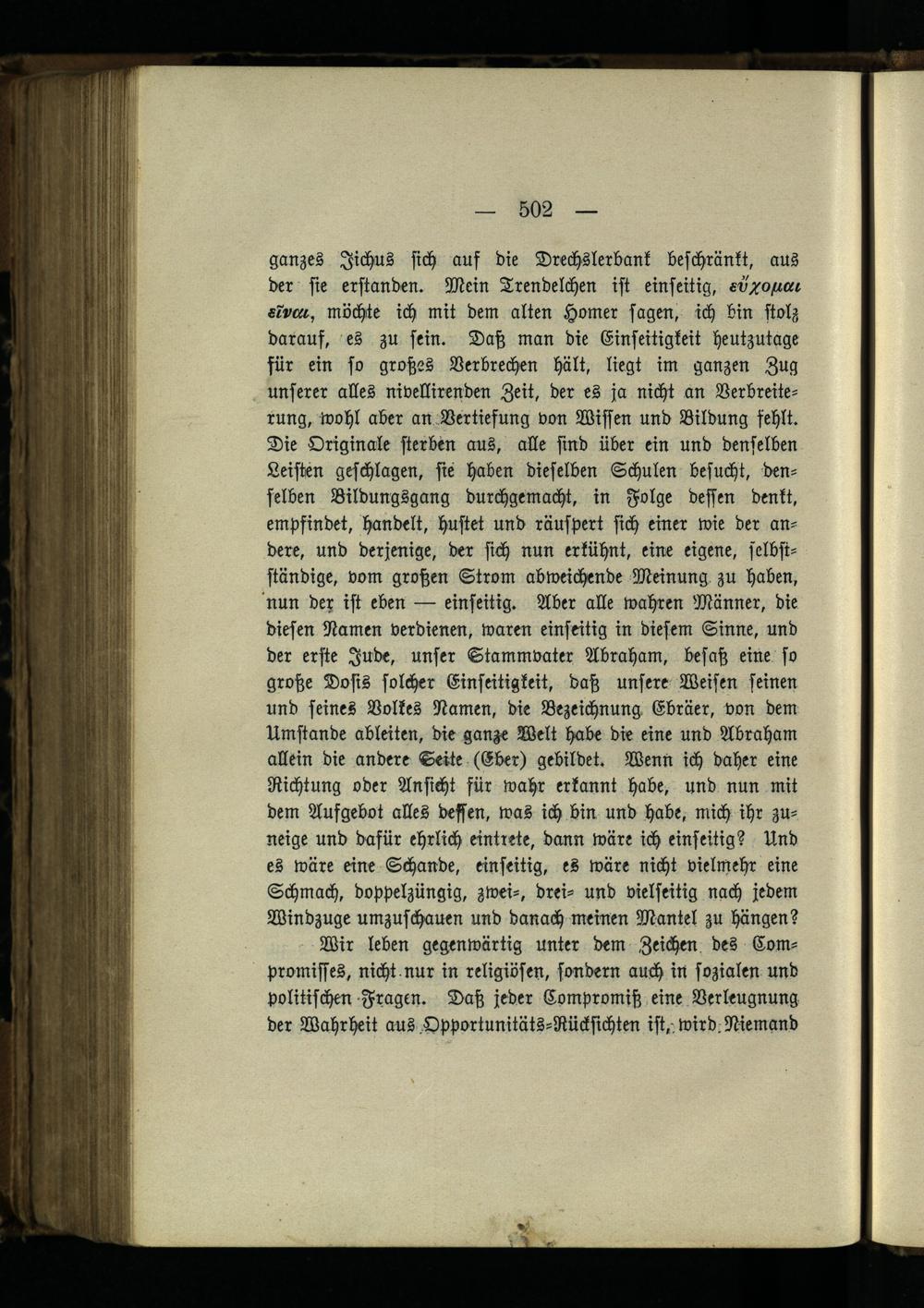 εἶναι , möchte ich mit dem alten Homer sagen, ich bin stolz darauf, es zu sein. Daß man die Einseitigkeit heutzutage für ein so großes Verbrechen hält, liegt im ganzen Zug unserer alles nivellirenden Zeit, der es ja nicht an Verbreiterung, wohl aber an Vertiefung von Wißen und Bildung fehlt. Die Originale sterben aus, alle sind über ein und denselben Leisten geschlagen, sie haben dieselben Schulen besucht, denselben Bildungsgang durchgemacht, in Folge dessen denkt, empfindet, handelt, hustet und räuspert sich einer wie der andere, und derjenige, der sich nun erkühnt, eine eigene, selbstständige, vom großen Strom abweichende Meinung zu haben, nun der ist eben — einseitig. Aber alle wahren Männer, die diesen Namen verdienen, waren einseitig in diesem Sinne, und der erste Jude, unser Stammvater Abraham, besaß eine so große Dosis solcher Einseitigkeit, daß unsere Weisen seinen und seines Volkes Namen, die Bezeichnung Ebräer, von dem Umstande ableiten, die ganze Welt Hab« di« eine und Abraham allein die andere Seite (Eber) gebildet. Wenn ich daher eine Richtung oder Ansicht für wahr erkannt habe, und nun mit dem Aufgebot alles dessen, was ich bin und habe, mich ihr zuneige und dafür ehrlich eintrete, dann wäre ich einseitig? Und es wäre eine Schande, einseitig, es wäre nicht vielmehr eine Schmach, doppelzüngig, zwei-, drei- und vielseitig nach jedem Windzuge umzuschauen und danach meinen Mantel zu hängen?