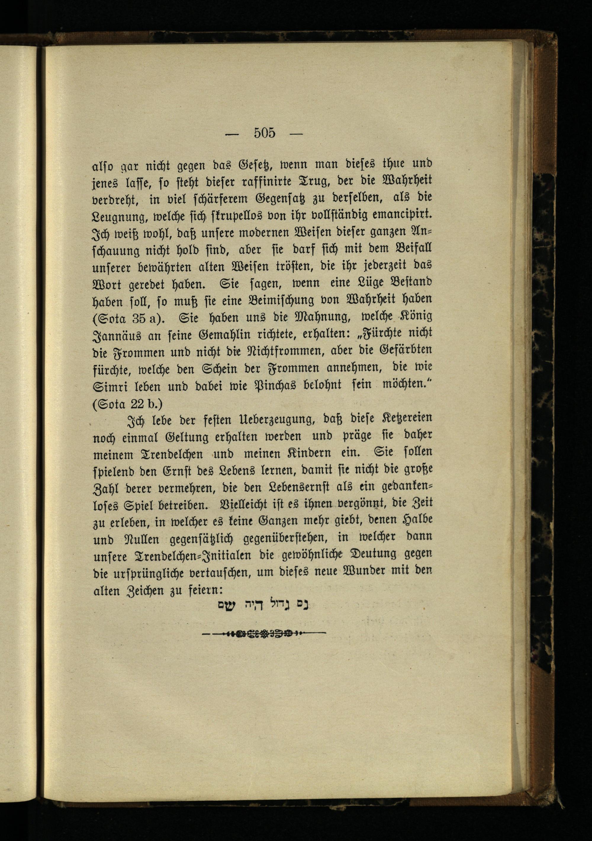 also gar nicht gegen das Gesetz, wenn man dieses thue und jenes lasse, so steht dieser raffinirte Trug, der die Wahrheit verdreht, in viel schärferem Gegensatz zu derselben, als die Leugnung, welche sich skrupellos von ihr vollständig emancipirt. Ich weiß wohl, daß unsere modernen Weisen dieser ganzen Anschauung nicht hold sind, aber sie darf sich mit dem Beifall unserer bewährten alten Weisen trösten, die ihr jederzeit das Wort geredet haben. Sie sagen, wenn eine Lüge Bestand haben soll, so muß sie eine Beimischung von Wahrheit haben (Sota 36 a). Sie haben uns die Mahnung, welche König Jannäus an seine Gemahlin richtete, erhalten: „Fürchte nicht die Frommen und nicht die Nichtfrommen, aber die Gefärbten fürchte, welche den Schein der Frommen annehmen, die wie Simri leben und dabei wie Pinchas belohnt sein möchten.'' (Sota 22 b.)