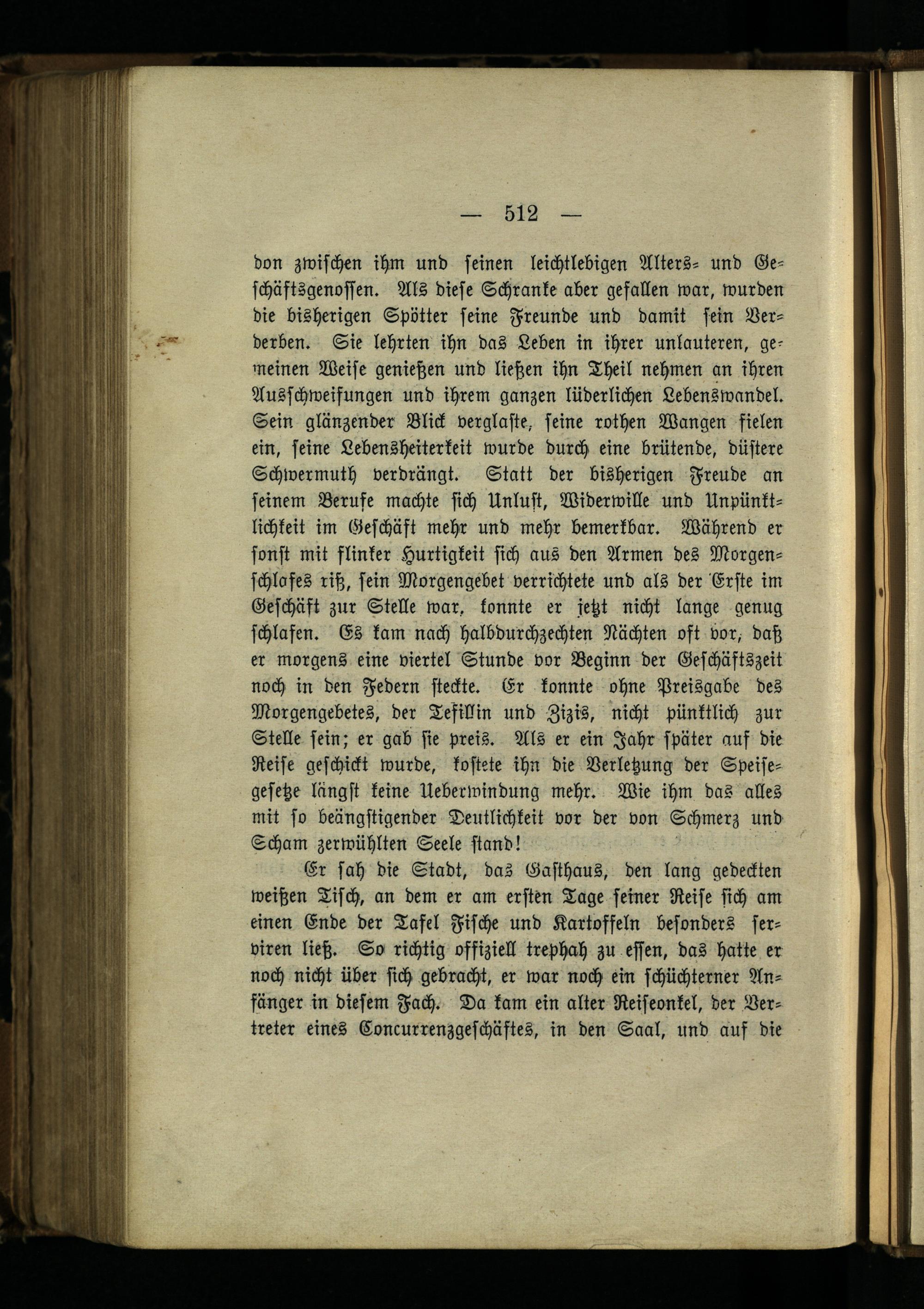 don zwischen ihm und seinen leichtlebigen Alters- und Geschäftsgenoffen. Als diese Schranke aber gefallen war, wurden die bisherigen Spötter seine Freunde und damit sein Verderben. Sie lehrten ihn das Leben in ihrer unlauteren, gemeinen Weise genießen und ließen ihn Theil nehmen an ihren Ausschweifungen und ihrem ganzen lüderlichen Lebenswandel. Sein glänzender Blick verglaste, seine rothen Wangen fielen ein, seine Lebensheiterkeit wurde durch eine brütende, düstere Schwermuth verdrängt. Statt der bisherigen Freude an seinem Berufe machte sich Unlust, Widerwille und Unpünktlichkeit im Geschäft mehr und mehr bemerkbar. Während er sonst mit flinker Hurtigkeit sich aus den Armen des Morgen- schlofes riß, sein Morgengebet verrichtete und als der Erste im Geschäft zur Stelle war, konnte er jetzt nicht lange genug schlafen. Es kam nach halbdurchzechten Nächten oft vor, daß er morgens eine viertel Stunde vor Beginn der Geschäftszeit noch in den Federn steckte. Er konnte ohne Preisgabe des Morgengebetes, der Tefillin und Zizis, nicht pünktlich zur Stelle sein; er gab sie Preis. Als er ein Jahr später auf die Reise geschickt wurde, kostete ihn die Verletzung der Speisegesetze längst keine Ueberwindung mehr. Wie ihm das alles mit so beängstigender Deutlichkeit vor der von Schmerz und Scham zerwühlten Seele stand!