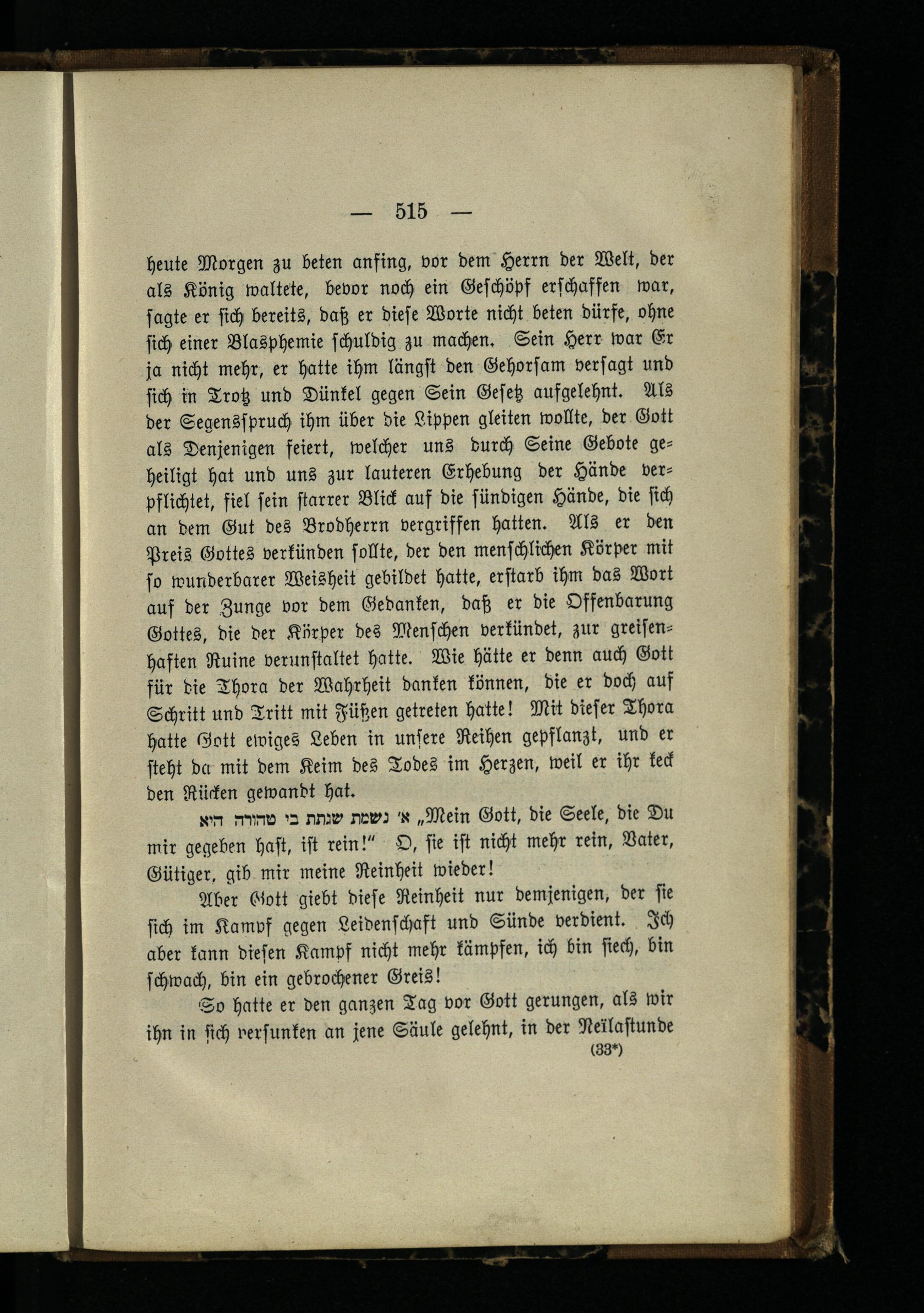 heute Morgen zu beten anfing, vor dem Herrn der Welt, der als König waltete, bevor noch ein Geschöpf erschaffen war, sagte er sich bereits, daß er diese Worte nicht beten dürfe, ohne sich einer Blasphemie schuldig zu machen. Sein Herr war Er ja nicht mehr, er hatte ihm längst den Gehorsam versagt und sich in Trotz und Dünkel gegen Sein Gesetz aufgelehnt. Als der Segensspruch ihm über die Lippen gleiten wollte, der Gott als Denjenigen feiert, welcher uns durch Seine Gebote geheiligt hat und uns zur lauteren Erhebung der Hände verpflichtet, siel sein starrer Blick auf die sündigen Hände, die sich an dem Gut des Brodherrn vergriffen hatten. Als er den Preis Gottes verkünden sollte, der den menschlichen Körper mit so wunderbarer Weisheit gebildet hatte, erstarb ihm das Wort aus der Zunge vor dem Gedanken, daß er die Offenbarung Gottes, die der Körper des Menschen verkündet, zur greisenhaften Ruine verunstaltet hatte. Wie hätte er denn auch Gott für die Thora der Wahrheit danken können, die er doch auf Schritt und Tritt mit Füßen getreten hatte! Mit dieser Thora hatte Gott ewiges Leben in unsere Reihen gepflanzt, und er steht da mit dem Keim des Todes im Herzen, weil er ihr keck den Rücken gewandt hat.
