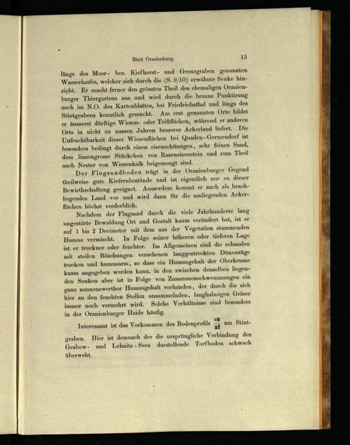 ‚längs des Moor- bez. Kiefhorst- und Grenzgraben genannten Wasserlaufes, welcher sich durch die(S. 9/10) erwähnte Senke hinzieht. Er macht ferner den grössten Theil des ehemaligen Oranien burger Thiergartens aus und wird durch die braune Punktirung auch im N.O. des, Kartenblattes, bei Friedrichsthal und längs des Stintgrabens kenntlich gemacht. Am erst genannten Orte bildet er äusserst dürftige Wiesen- oder Triftflächen, während er anderen Orts in nicht zu nassen Jahren besseres Ackerland liefert. Die Unfruchtbarkeit dieser Wiesenflächen bei Quaden- Germendorf ist - besonders bedingt durch einen eisenschüssigen, sehr feinen Sand, dem linsengrosse Stückchen von Raseneisenstein und zum Theil auch Nester von Wiesenkalk beigemengt sind.