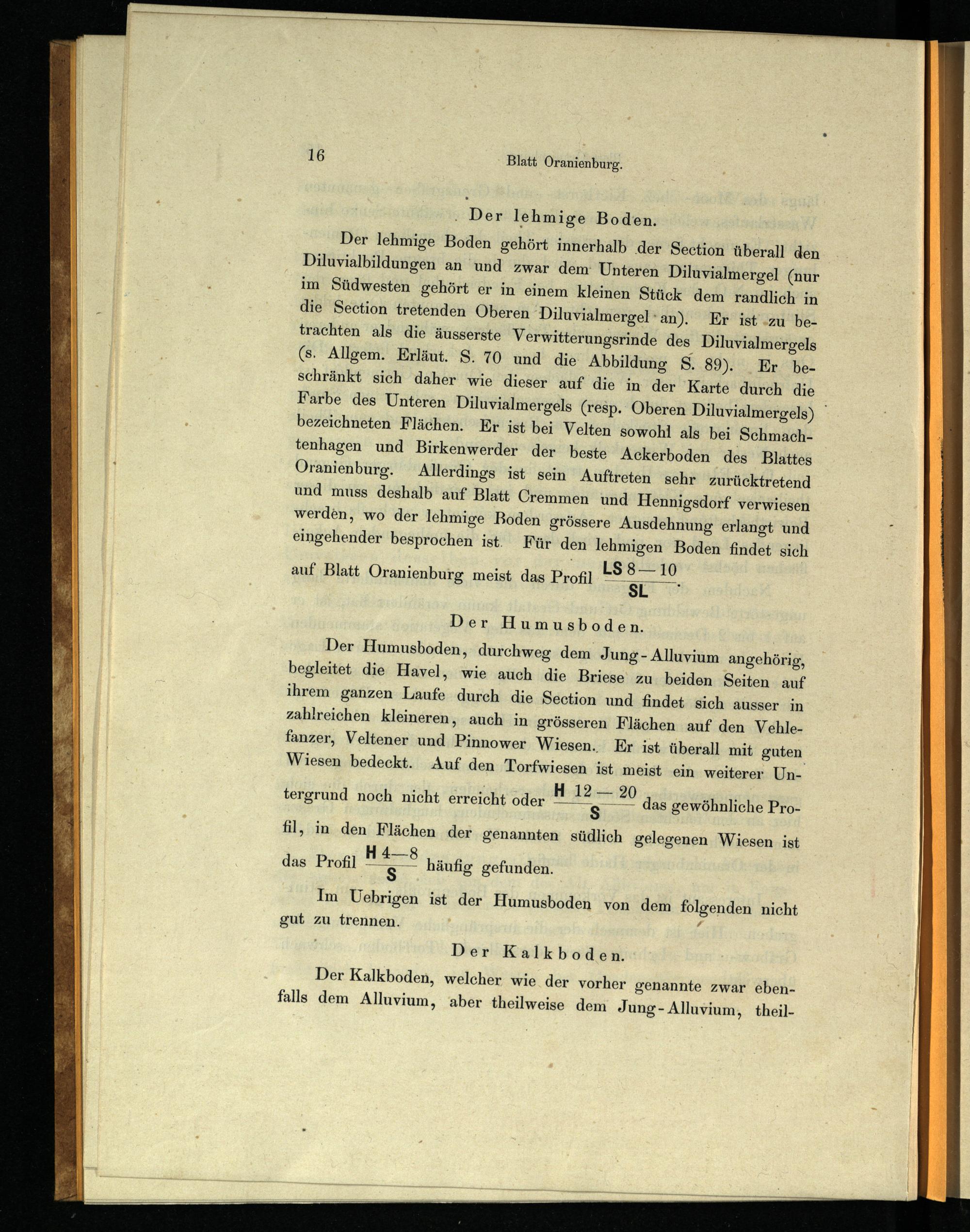 Der lehmige Boden gehört innerhalb der Section überall den Diluvialbildungen an und zwar dem Unteren Diluvialmergel(nur im Südwesten gehört er in einem kleinen Stück dem randlich in die Section tretenden Oberen‘Diluvialmergel+ an). Er ist.zu betrachten als die äusserste Verwitterungsrinde des Diluvialmergels (s. Allgem. Erläut. S. 70 und die Abbildung S. 89); Er. beschränkt sich daher wie dieser auf die in der Karte durch die Farbe des Unteren Diluvialmergels(resp. Oberen Diluvialmergels) bezeichneten Flächen. Er ist bei Velten sowohl als bei Schmachtenhagen und Birkenwerder der beste Ackerboden des Blattes Oranienburg . Allerdings ist sein Auftreten sehr zurücktretend und muss deshalb auf Blatt Cremmen und Hennigsdorf verwiesen werden, wo der lehmige Boden grössere Ausdehnung erlangt und