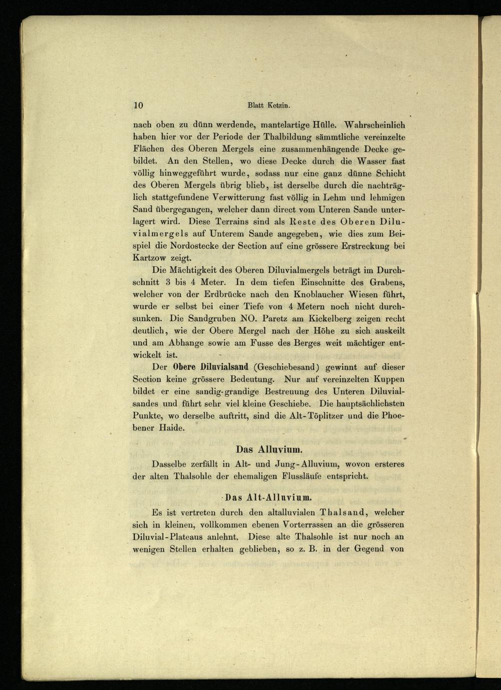 Die Mächtigkeit des Oberen Diluvialmergels beträgt im Durchschnitt 3 bis 4 Meter. In dem tiefen Einschnitte des Grabens, welcher von der Erdbrücke nach den Knoblaucher Wiesen führt, wurde er selbst bei einer Tiefe von 4 Metern noch nicht durchsunken. Die Sandgruben NO. Paretz am Kickelberg zeigen recht deutlich, wie der Obere Mergel nach der Höhe zu sich auskeilt und am Abhange sowie am Fusse des Berges weit mächtiger entwickelt ist.;