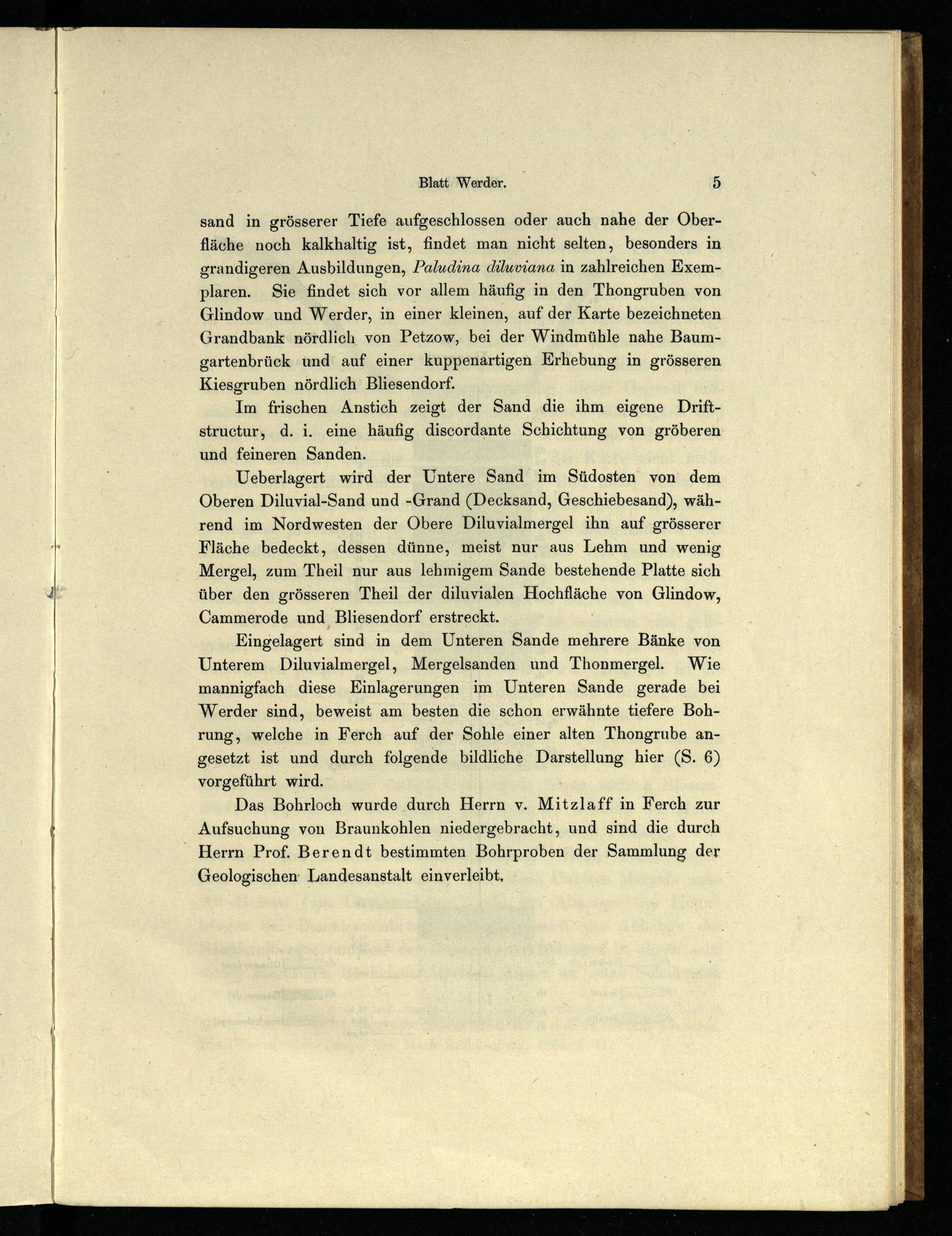 sand in grösserer Tiefe aufgeschlossen oder auch nahe der Oberfläche noch kalkhaltig ist, findet man nicht selten, besonders in grandigeren Ausbildungen, Paludina dilwviana in zahlreichen Exemplaren. Sie findet sich vor allem häufig in den Thongruben von Glindow und Werder, in einer kleinen, auf der Karte bezeichneten Grandbank nördlich von Petzow , bei der Windmühle nahe Baumgartenbrück und auf einer kuppenartigen Erhebung in grösseren Kiesgruben nördlich Bliesendorf.