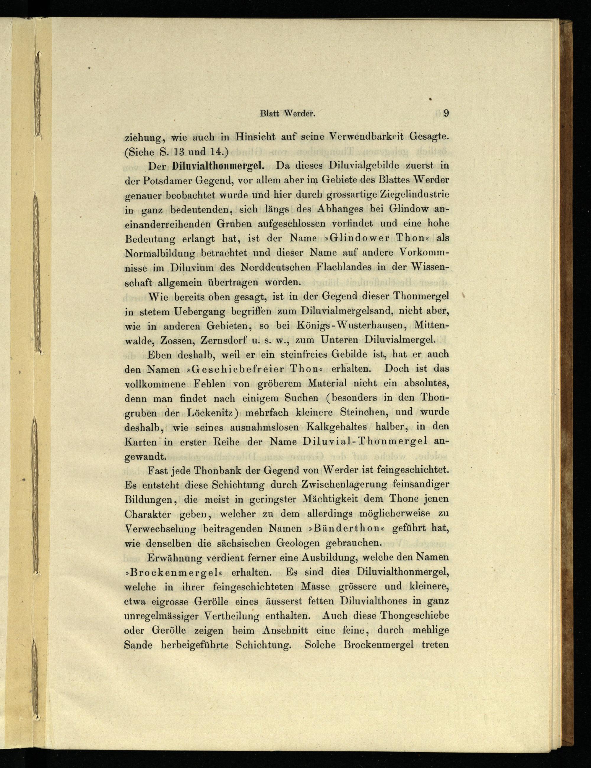 Der Diluvialthonmergel. Da dieses Diluvialgebilde zuerst in der Potsdamer Gegend, vor allem aber im Gebiete des Blattes Werder genauer beobachtet wurde und hier durch grossartige Ziegelindustrie in ganz bedeutenden, sich längs des Abhanges bei Glindow aneinanderreihenden Gruben aufgeschlossen vorfindet und eine hohe Bedeutung erlangt hat, ist der Name»Glindower Thon« als Normalbildung betrachtet und dieser Name auf andere Vorkommnisse im Diluvium des Norddeutschen Flachlandes in der Wissenschaft allgemein übertragen worden.