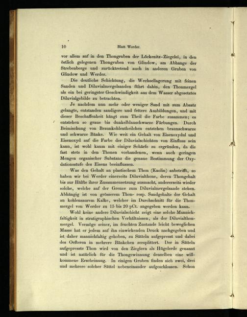 Was den Gehalt an plastischem Thon(Kaolin) anbetrifft, so haben wir bei Werder einerseits Diluvialthone, deren Thongehalt bis zur Hälfte ihrer Zusammensetzung ausmacht, andererseits wieder solche, welche auf der Grenze zum Diluvialmergelsande stehen. Abhängig ist von grösserem Thon- resp. Sandgehalte der Gehalt an kohlensaurem Kalke, welcher im Durchschnitt für die Thonmergel von Werder zu 15 bis 20 pCt. angegeben werden kann.