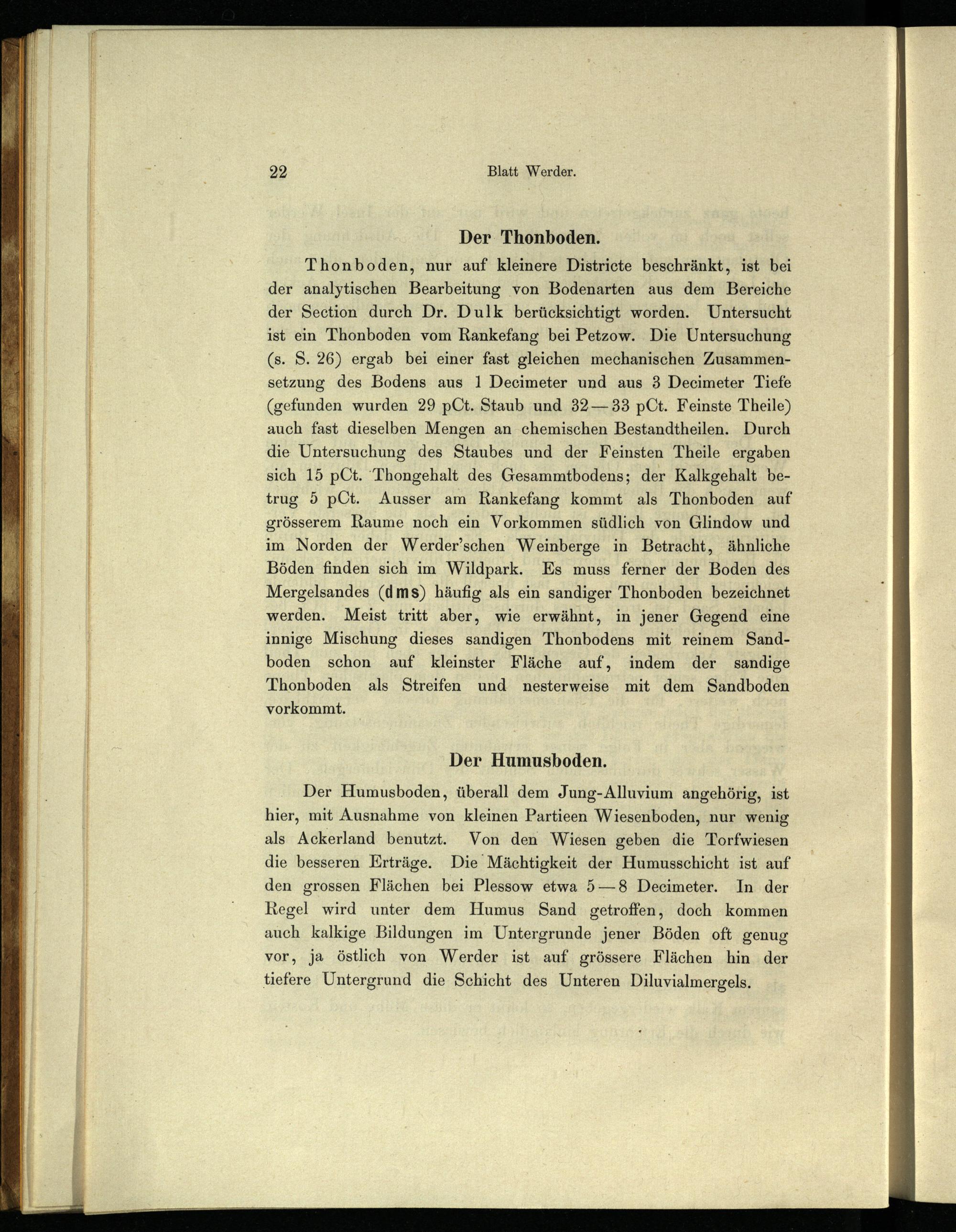 Der Humusboden, überall dem Jung-Alluvium angehörig, ist hier, mit Ausnahme von kleinen Partieen Wiesenboden, nur wenig als Ackerland benutzt. Von den Wiesen geben die Torfwiesen die besseren Erträge. Die Mächtigkeit der Humusschicht ist auf den grossen Flächen bei Plessow etwa 5—8 Decimeter. In der Regel wird unter dem Humus Sand getroffen, doch kommen auch kalkige Bildungen im Untergrunde jener Böden oft genug vor, ja östlich von Werder ist auf grössere Flächen hin der tiefere Untergrund die Schicht des Unteren Diluvialmergels,