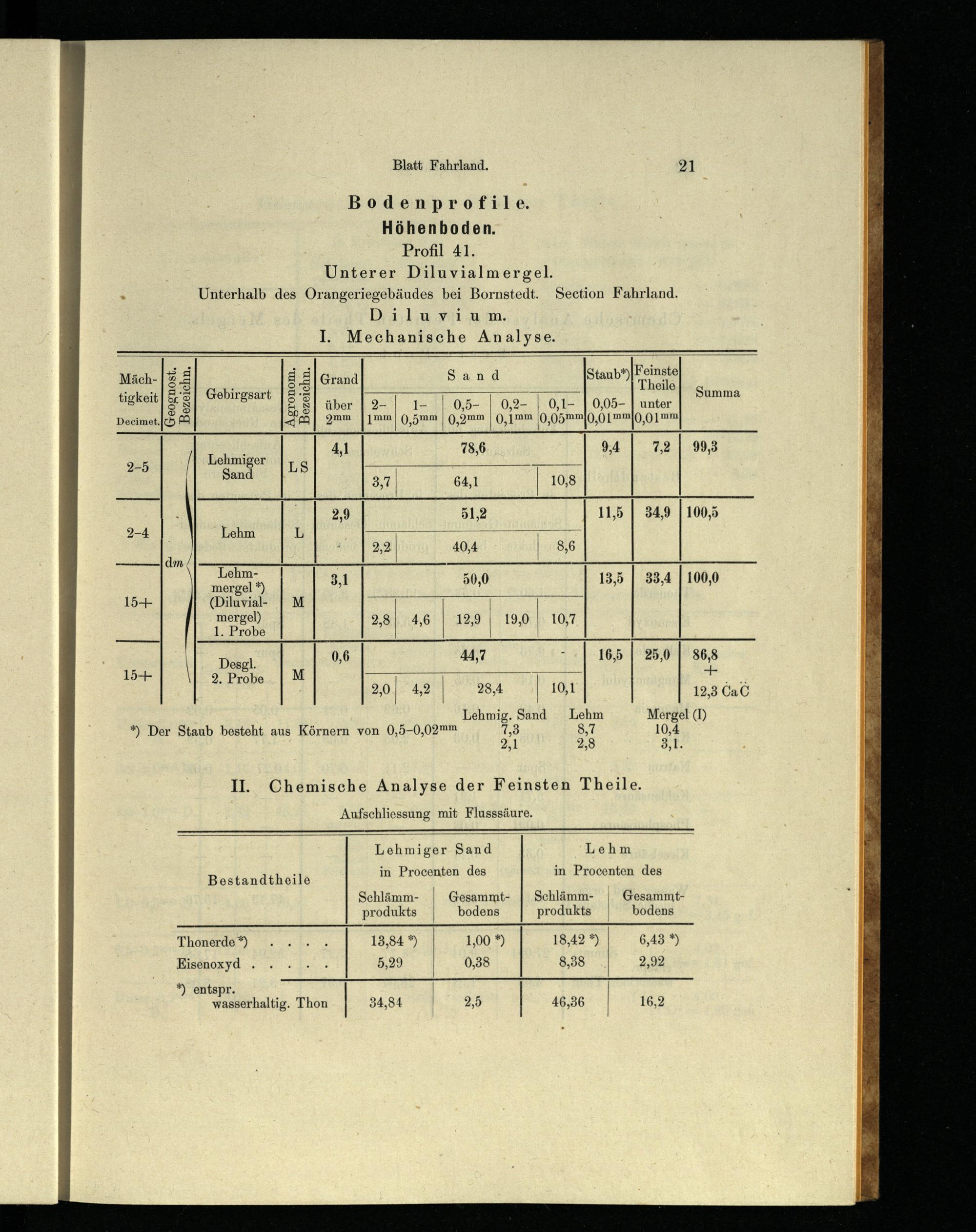 Bodenprofile. Höhenboden. Profil 41. Unterer Diluvialmergel. Unterhalb des Orangeriegebäudes bei Bornstedt. Section Fahrland. Diluryium. I. Mechanische Analyse.