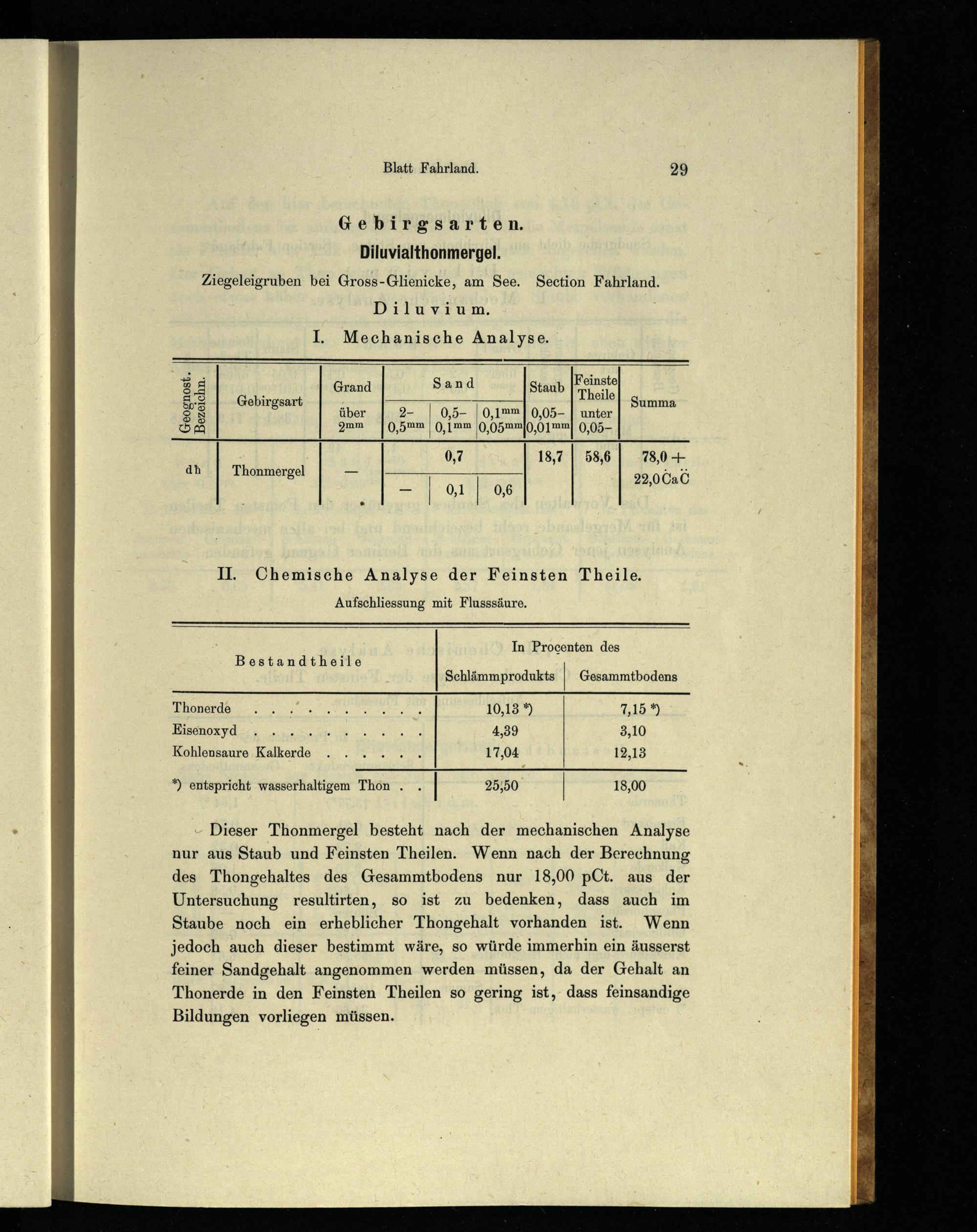 - Dieser Thonmergel besteht nach der mechanischen Analyse nur aus Staub und Feinsten Theilen. Wenn nach der Berechnung des Thongehaltes des Gesammtbodens nur 18,00 pCt. aus der Untersuchung resultirten, so ist zu bedenken, dass auch im Staube noch ein erheblicher Thongehalt vorhanden ist. Wenn jedoch auch dieser bestimmt wäre, so würde immerhin ein äusserst feiner Sandgehalt angenommen werden müssen, da der Gehalt an Thonerde in den Feinsten Theilen so gering ist, dass feinsandige Bildungen vorliegen müssen.