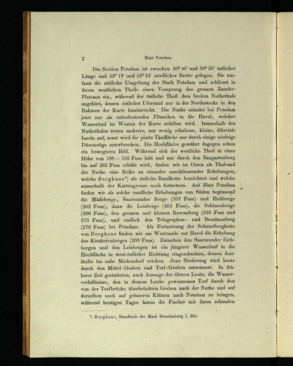 Die Section Potsdam ist zwischen 30° 40' und 30° 50' östlicher Länge und 52° 18' und 52° 24' nördlicher Breite gelegen. Sie umfasst die südliche Umgebung der Stadt Potsdam und schliesst in ihrem westlichen Theile einen Vorsprung des grossen Zauche- Plateaus ein, während der östliche Theil dem breiten Nuthethale angehört, dessen östlicher Uferrand nur in der Nordostecke in den Rahmen der Karte hineinreicht. Die Nuthe mündet bei Potsdam jetzt nur als unbedeutendes Flüsschen in die Havel , welcher Wasserlauf im Westen der Karte sichtbar wird. Innnerhalb des Nuthethales treten mehrere, nur wenig erhabene, kleine, diluviale Inseln auf, sonst wird die platte Thalfläche nur durch einige niedrige Dünenzüge unterbrochen. Die Hochfläche gewährt dagegen schon ein bewegteres Bild. Während sich der westliche Theil in einer Höhe von 180—195 Fuss hält und nur durch den Saugartenberg bis auf 262 Fuss erhöht wird, finden wir im Osten als Thalrand der Nuthe eine Reihe an einander anschliessender Erhebungen, welche Berghaus*) als östliche Randkette bezeichnet und welche ausserhalb der Kartengrenze noch fortsetzen. Auf Blatt Potsdam finden wir als solche randliche Erhebungen von Süden beginnend die Mädeberge, Saarmunder Berge (307 Fuss) und Eichberge (302 Fuss), dann die Leisberge (265 Fuss), die Schönenberge (300 Fuss), den grossen und kleinen Ravensberg (350 Fuss und 373 Fuss), und endlich den Telegraphen- und Brauhausberg (270 Fuss) bei Potsdam . Als Fortsetzung der Schmerbergkette von Berghaus finden wir am Westrande zur Havel die Erhebung des Kieskutenberges (208 Fuss). Zwischen den Saarmunder Eichbergen und den Leisbergen ist ein jüngerer Wasserlauf in die Hochfläche in west-östlicher Richtung eingeschnitten, dessen Ausläufer bis nahe Michendorf reichen. Jene Niederung wird heute durch den Mittel-Graben und Torf-Graben entwässert. In früherer Zeit gestatteten, nach Aussage der älteren Leute, die Wasserverhältnisse, den in diesem Luche gewonnenen Torf durch den von der Torfbrücke überbrückten, Graben nach der Nuthe und auf derselben noch auf grösseren Kähnen nach Potsdam zu bringen, während heutigen Tages kaum die Fischer mit ihren schmalen