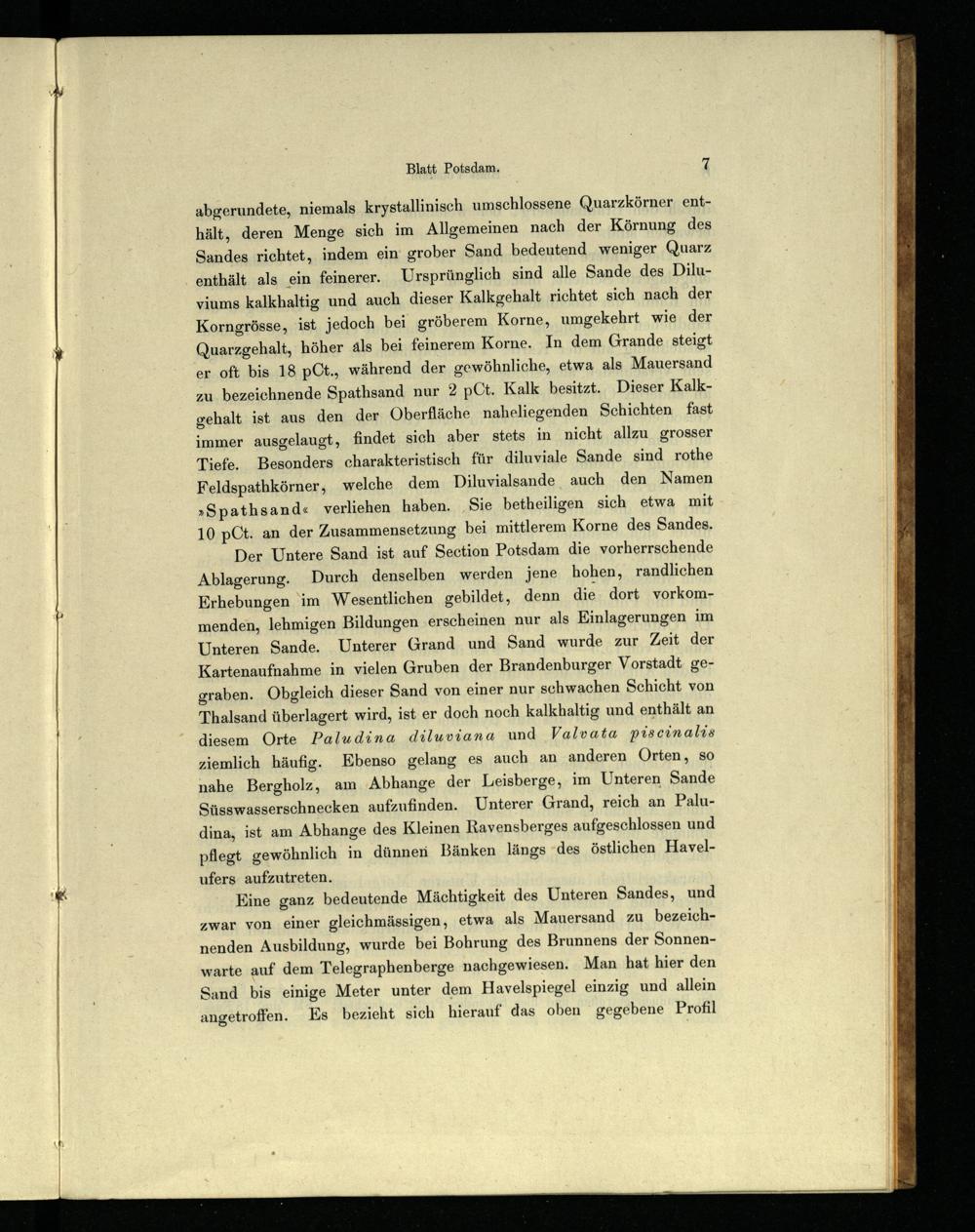 Der Untere Sand ist auf Section Potsdam die vorherrschende Ablagerung. Durch denselben werden jene hohen, randlichen Erhebungen im Wesentlichen gebildet, denn die dort vorkommenden, lehmigen Bildungen erscheinen nur als Einlagerungen im Unteren Sande. Unterer Grand und Sand wurde zur Zeit der Kartenaufnahme in vielen Gruben der Brandenburger Vorstadt gegraben. Obgleich dieser Sand von einer nur schwachen Schicht von Thalsand überlagert wird, ist er doch noch kalkhaltig und enthält an diesem Orte Paludina diluviana und Valvata piscinalis ziemlich häufig. Ebenso gelang es auch an anderen Orten, so nahe Bergholz, am Abhange der Leisberge, im Unteren Sande Süsswasserschnecken aufzufinden. Unterer Grand, reich an Paludina, ist am Abhange des Kleinen Ravensberges aufgeschlossen und pflegt gewöhnlich in dünnen Bänken längs des östlichen Havelufers aufzutreten.