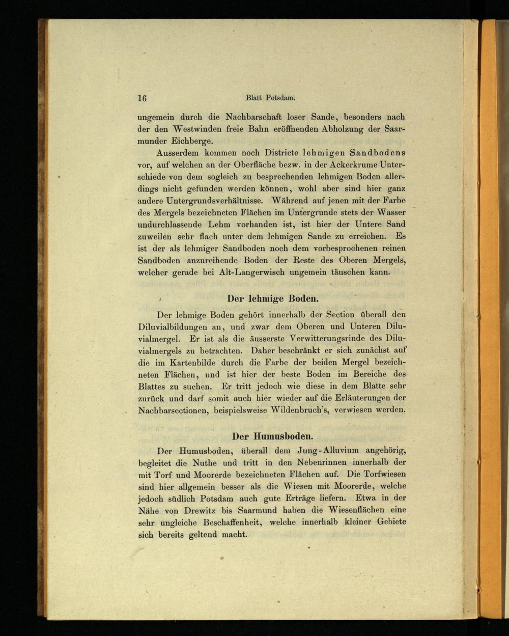 Der lehmige Boden gehört innerhalb der Section überall den Diluvialbildungen an, und zwar dem Oberen und Unteren Diluvialmergel. Er ist als die äusserste Verwitterungsrinde des Diluvialmergels zu betrachten. Daher beschränkt er sich zunächst auf die im Kartenbilde durch die Farbe der beiden Mergel bezeichneten Flächen, und ist hier der beste Boden im Bereiche des Blattes zu suchen. Er tritt jedoch wie diese in dem Blatte sehr zurück und darf somit auch hier wieder auf die Erläuterungen der Nachbarsectionen, beispielsweise Wildenbruch’s, verwiesen werden.