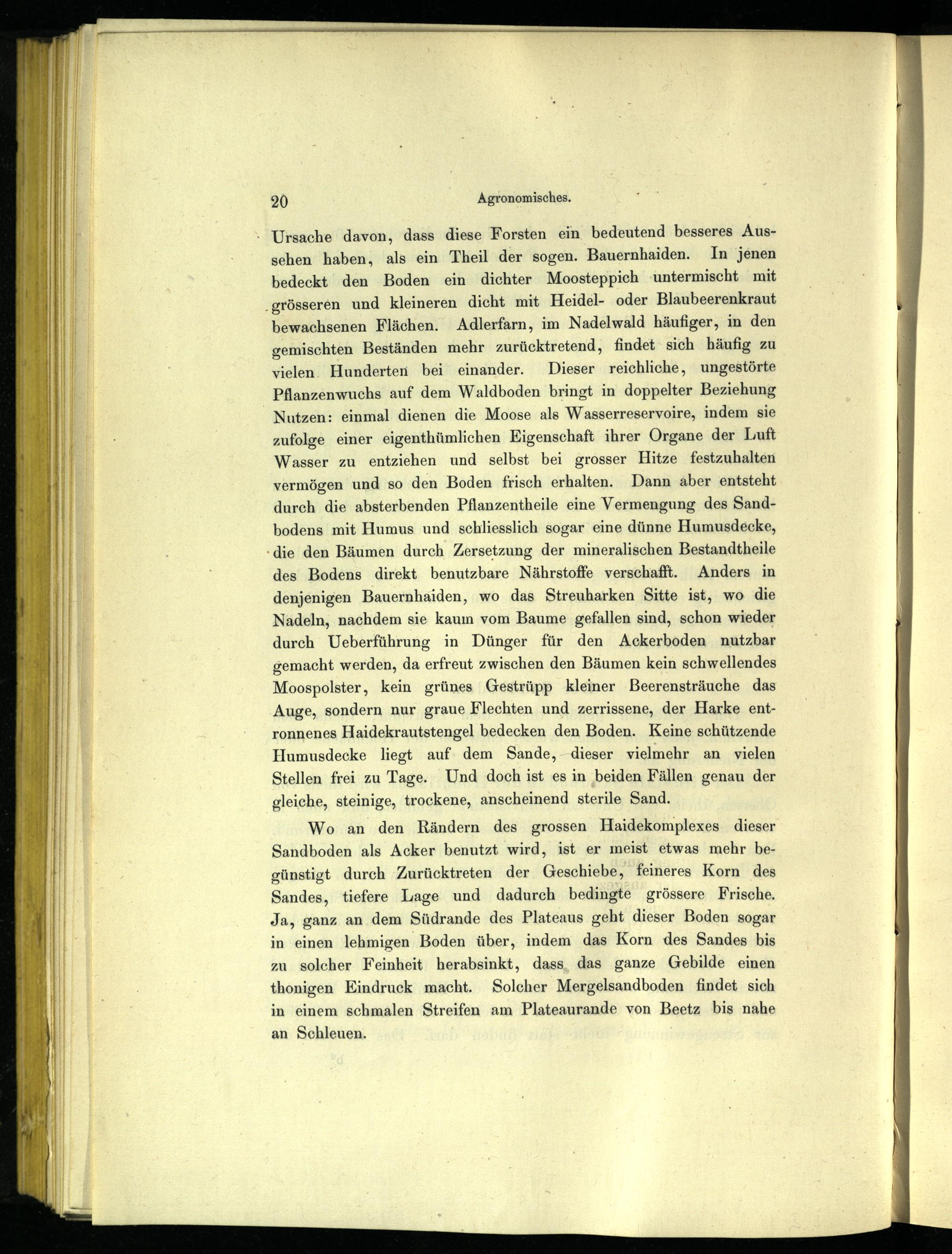 Wo an den Rändern des grossen Haidekomplexes. dieser Sandboden als Acker benutzt wird, ist er meist etwas mehr begünstigt durch Zurücktreten der Geschiebe, feineres Korn des Sandes, tiefere Lage und dadurch bedingte grössere Frische. Ja, ganz an dem Südrande des Plateaus geht dieser Boden sogar in einen lehmigen Boden über, indem das Korn des Sandes bis zu solcher Feinheit herabsinkt, dass, das ganze Gebilde einen thonigen Eindruck macht. Solcher Mergelsandboden findet sich in einem schmalen Streifen am Plateaurande von Beetz bis nahe
