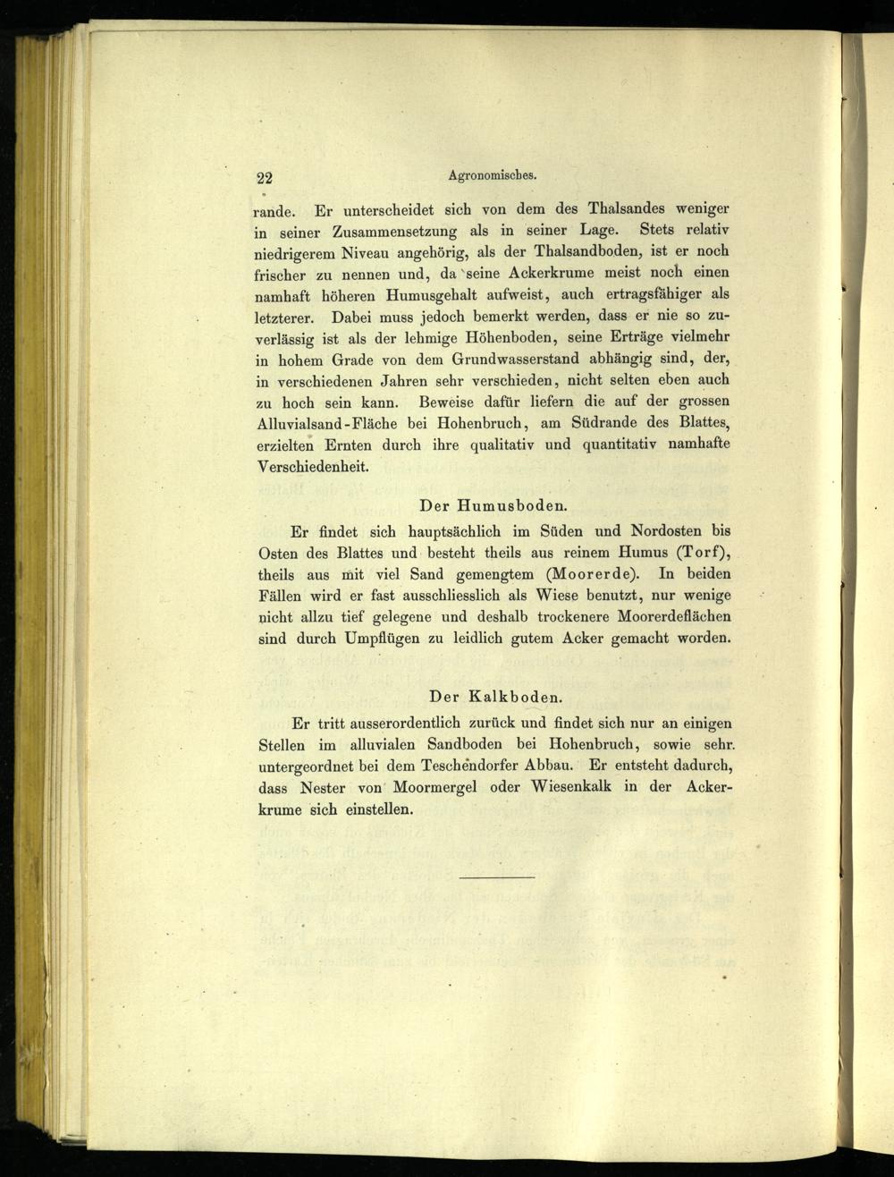 rande. Er unterscheidet sich von dem des Thalsandes weniger in seiner Zusammensetzung als in seiner Lage. Stets relativ niedrigerem Niveau angehörig, als der Thalsandboden, ist er noch frischer zu nennen und, da‘seine Ackerkrume meist noch einen namhaft höheren Humusgehalt aufweist, auch ertragsfähiger als letzterer. Dabei muss jedoch bemerkt werden, dass er nie so zuverlässig ist als der lehmige Höhenboden, seine Erträge vielmehr in hohem Grade von dem Grundwasserstand abhängig sind, der, in verschiedenen Jahren sehr verschieden, nicht selten eben auch zu hoch sein kann. Beweise dafür liefern die auf der grossen Alluvialsand- Fläche bei Hohenbruch, am Südrande des Blattes, erzielten Ernten durch ihre qualitativ und quantitativ namhafte Verschiedenheit.