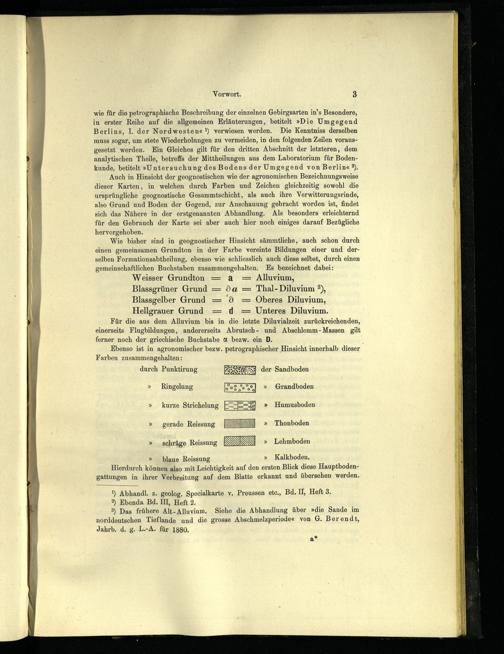 Auch in Hinsicht der geognostischen wie der agronomischen Bezeichnungsweise dieser Karten, in welchen durch Farben und Zeichen gleichzeitig sowohl die ursprüngliche geognostische Gesammtschicht, als auch ihre Verwitterungsrinde, also Grund und Boden der Gegend, zur Anschauung gebracht worden ist, findet sich das Nähere in der erstgenannten Abhandlung. Als besonders erleichternd für den Gebrauch der Karte sei aber auch hier noch einiges darauf Bezügliche hervorgehoben.