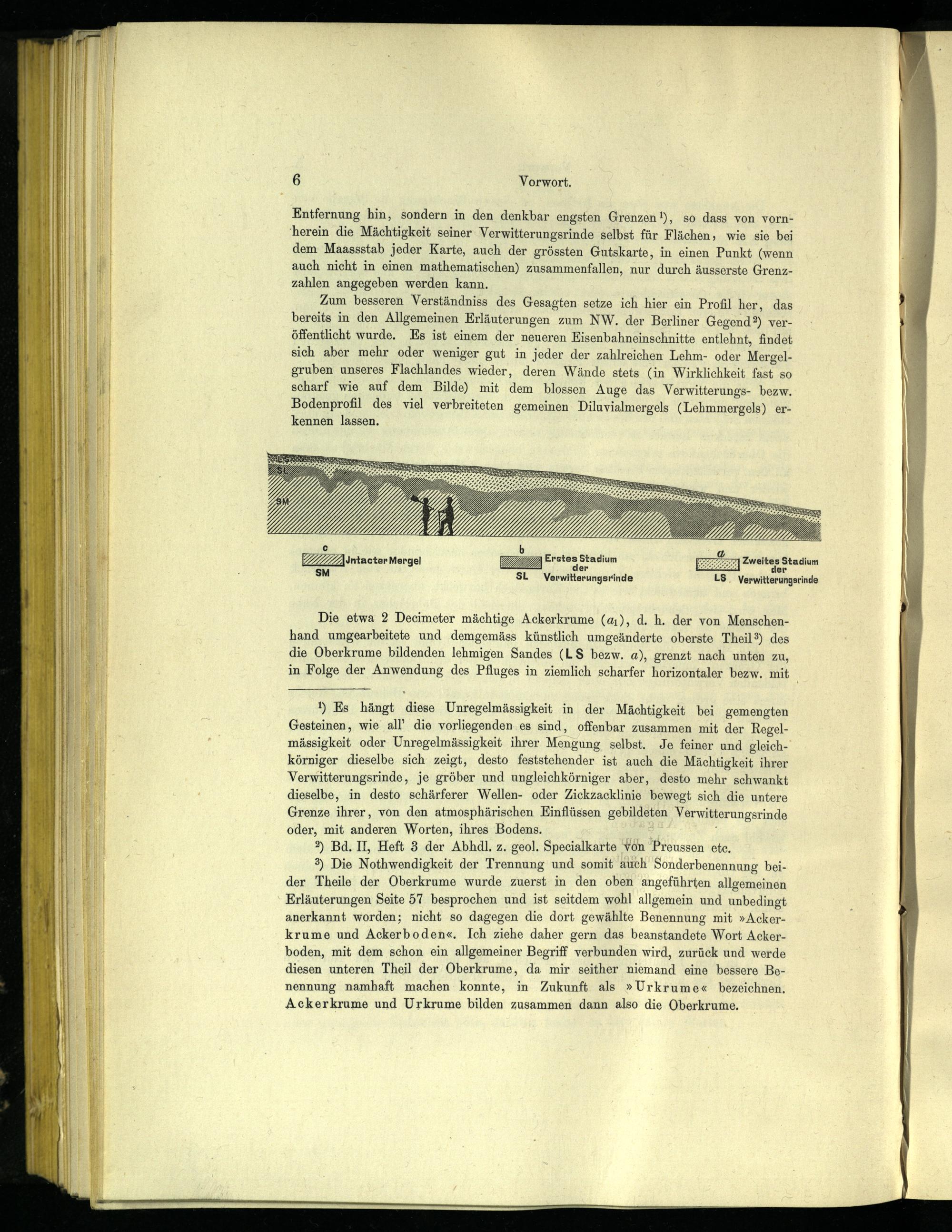 3) Die Nothwendigkeit der Trennung und somit auch Sonderbenennung beider Theile der Oberkrume wurde zuerst in den oben angeführten allgemeinen Erläuterungen Seite 57 besprochen und ist seitdem wohl allgemein und unbedingt anerkannt worden; nicht so dagegen die dort gewählte Benennung mit»Ackerkrume und Ackerboden«. Ich ziehe daher gern das beanstandete Wort Ackerboden, mit dem schon ein allgemeiner Begriff verbunden wird, zurück und werde diesen unteren Theil der Oberkrume, da mir seither niemand eine bessere Benennung namhaft machen konnte, in Zukunft als»Urkrume« bezeichnen. Ackerkrume und Urkrume bilden zusammen dann also die Oberkrume.