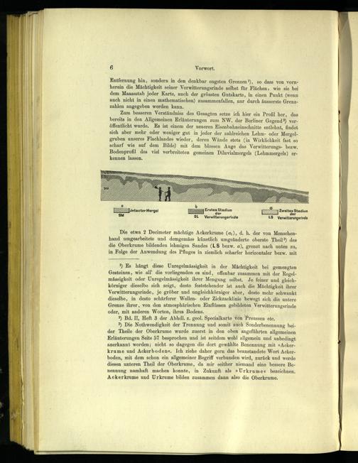 Entfernung hin, sondern in den denkbar engsten Grenzen!), so dass von vorn‘herein die Mächtigkeit seiner Verwitterungsrinde selbst für Flächen, wie sie bei dem Maassstab jeder Karte, auch der grössten Gutskarte, in einen Punkt(wenn auch nicht in einen mathematischen) zusammenfallen, nur durch äusserste Grenzzahlen angegeben werden kann.