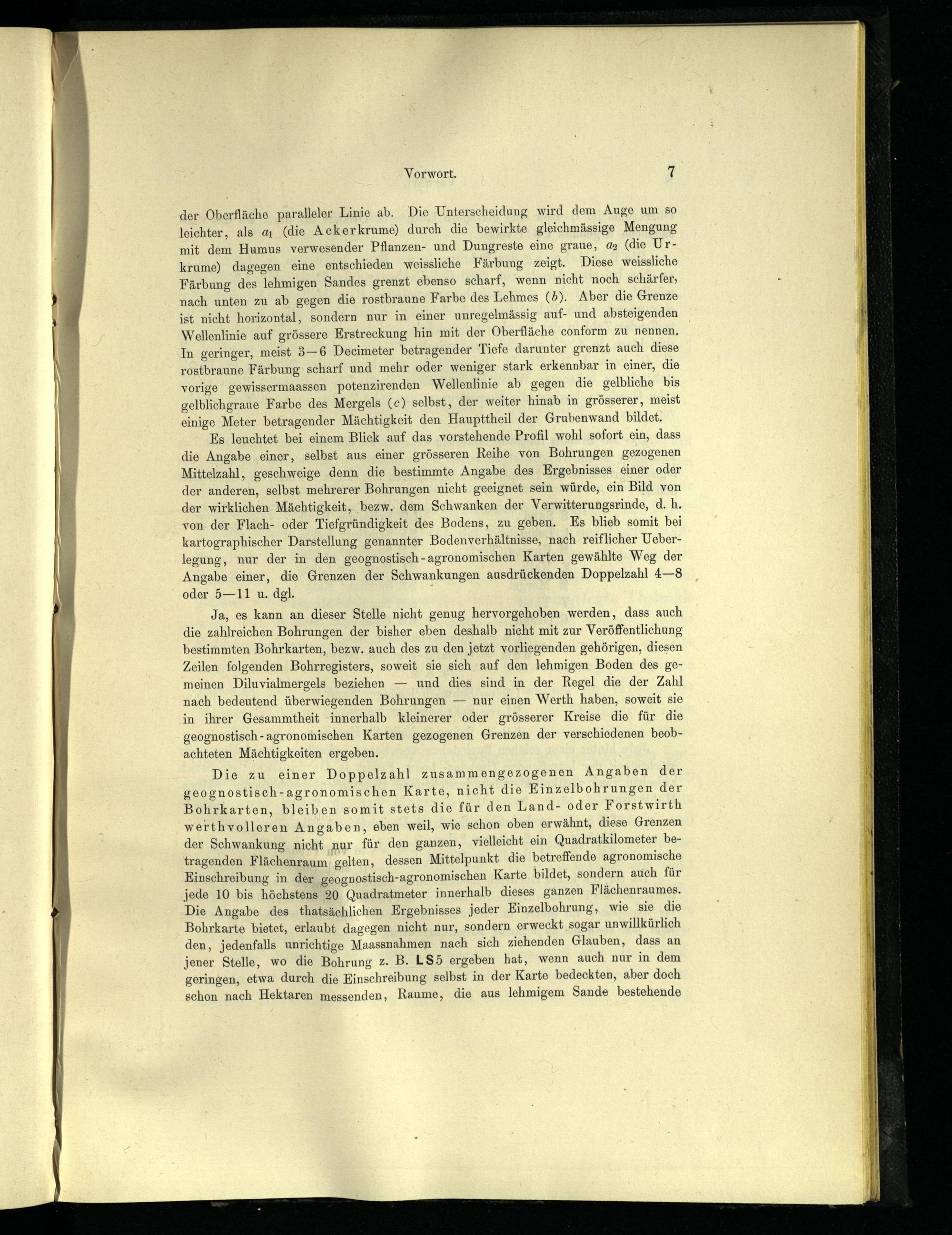 Die zu einer Doppelzahl zusammengezogenen Angaben der geognostisch-agronomischen Karte, nicht die Einzelbohrungen der Bohrkarten, bleiben somit stets die für den Land- oder Forstwirth werthvolleren Angaben, eben weil, wie schon oben erwähnt, diese Grenzen der Schwankung nicht nur für den ganzen, vielleicht ein Quadratkilometer betragenden Flächenraum, gelten, dessen Mittelpunkt die betreffende agronomische Kinschreibung in der geognostisch-agronomischen Karte bildet, sondern auch für jede 10 bis höchstens 20 Quadratmeter innerhalb dieses ganzen Flächenraumes. Die Angabe des thatsächlichen Ergebnisses jeder Einzelbohrung, wie sie die Bohrkarte bietet, erlaubt dagegen nicht nur, sondern erweckt sogar unwillkürlich den, jedenfalls unrichtige Maassnahmen nach sich ziehenden Glauben, dass an jener Stelle, wo die Bohrung z. B. LS5 ergeben hat, wenn auch nur in dem geringen, etwa durch die Einschreibung selbst in der Karte bedeckten, aber doch schon nach Hektaren messenden, Raume, die aus lehmigem Sande bestehende