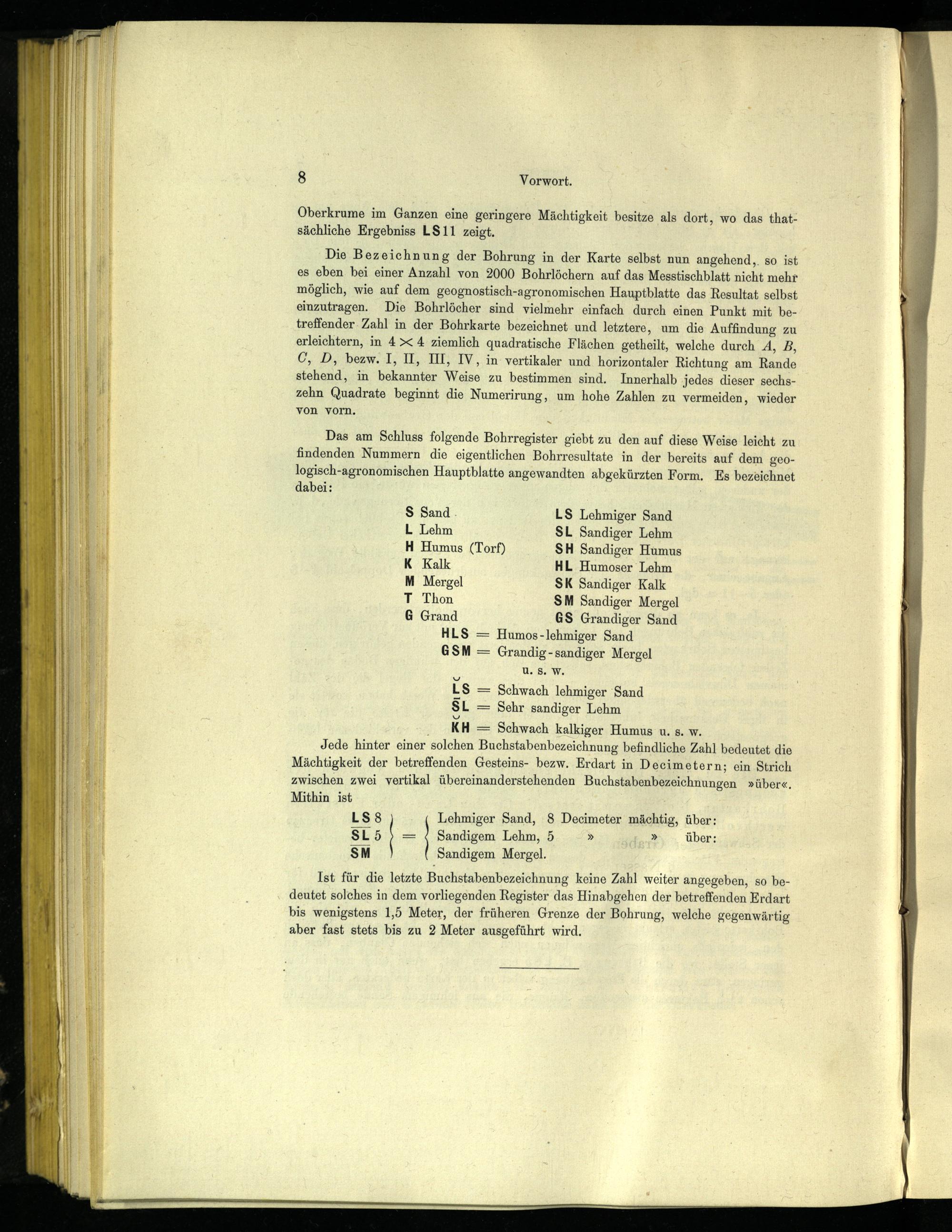 Ist für die letzte Buchstabenbezeichnung keine Zahl weiter angegeben, so bedeutet solches in dem vorliegenden Register das Hinabgehen der betreffenden Erdart bis wenigstens 1,5 Meter, der früheren Grenze der Bohrung, welche gegenwärtig aber fast stets bis zu 2 Meter ausgeführt wird.