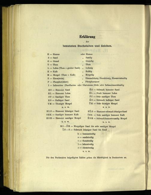 H= Humus oder Humos S= Sand Sandig G= Grand Grandig T== Thon Thon L= Lehm(Thon+grober Sand) Lehmig K= Kalk Kalkig M= Mergel(Thon+ Kalk) Mergelig E= Hisen(stein) Eisenschüssig, Eisenkörnig, Eisensteinhaltig P= Phosphor(säure) Phosphorsauer =— Infusorien-(Bacillarien- oder Diatomeen-)Erde oder Infusorienerdehaltig