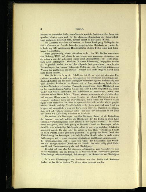 Wenn gegenwärtig, ebenso wie schon in der, den NO. Berlins ausmachenden Lieferung XXIX und ebenso in den beiden oben genannten Lieferungen aus der Altmark und der Uckermark einem jeden Messtischblatte eine solche Bohrkarte nebst Bohrregister(Abschnitt IV dieser Erläuterung) beigegeben worden ist, so geschah solches nur auf den allgemein laut gewordenen, auch in den Verhandlungen des Landes-Oekonomie- Collegiums zum Ausdruck gekommenen Wunsch des praktischen Landwirthes, welcher eine solche Beigabe hinfort nicht mehr missen möchte.