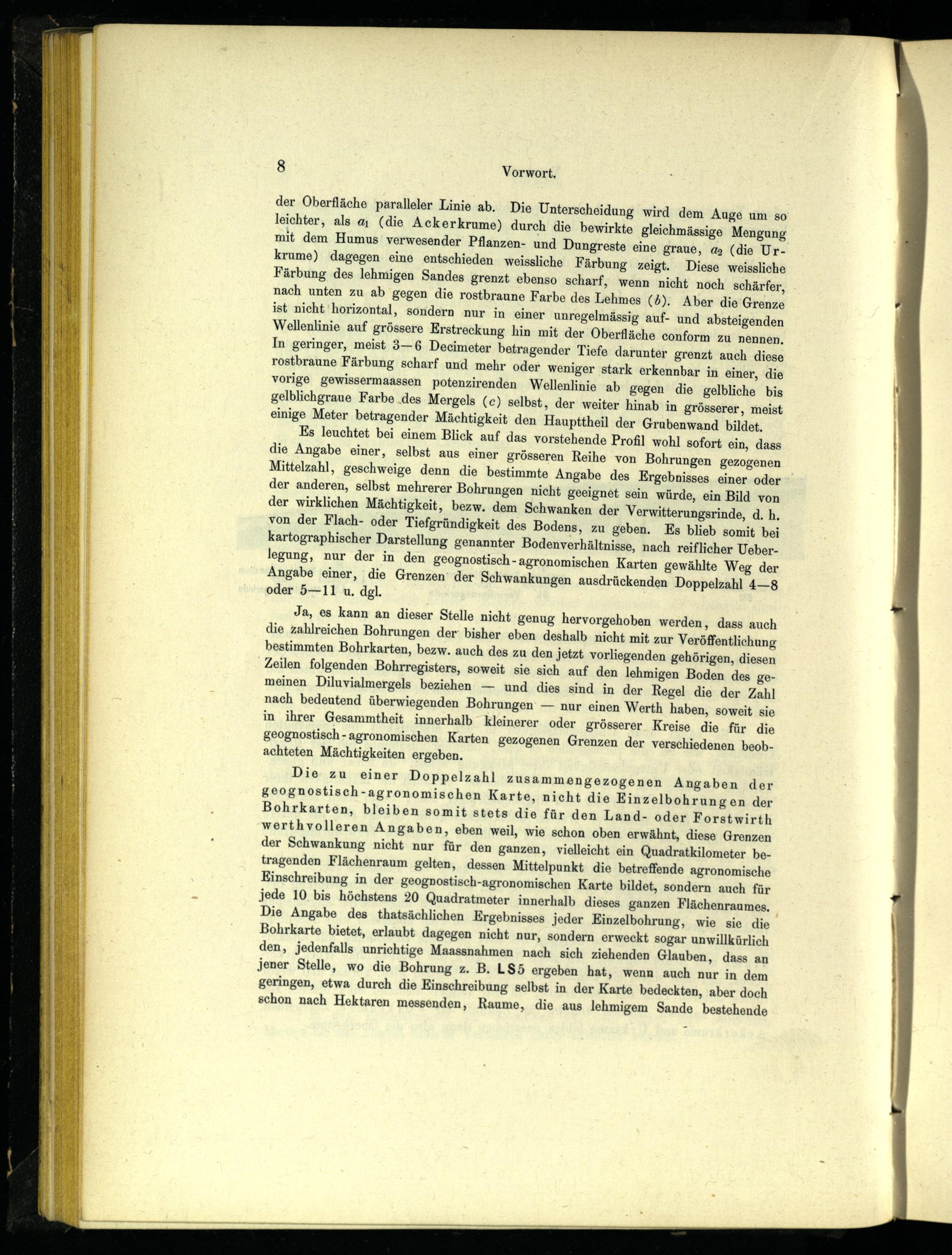 Die zu einer Doppelzahl Zusammengezogenen Angaben der geognostisch-agronomischen Karte, nicht die Einzelbohrungen der Bohrkarten, bleiben somit stets die für den Land- oder Forstwirth werthvolleren Angaben, eben weil, wie schon oben erwähnt, diese Grenzen der Schwankung nicht nur für den ganzen, vielleicht ein Quadratkilometer betragenden Flächenraum gelten, dessen Mittelpunkt die betreffende agronomische Einschreibung in der geognostisch-agronomischen Karte bildet, sondern auch für jede 10 bis höchstens 20 Quadratmeter innerhalb dieses ganzen Flächenraumes.; Die Angabe des thatsächlichen Ergebnisses jeder Einzelbohrung, wie sie die Bohrkarte bietet, erlaubt dagegen nicht nur, sondern erweckt sogar unwillkürlich den, jedenfalls unrichtige Maassnahmen nach sich ziehenden Glauben, dass an jener Stelle, wo die Bohrung z. B. LS5 ergeben hat, wenn auch nur in dem geringen, etwa durch die Einschreibung selbst in der Karte bedeckten, aber doch schon nach Hektaren messenden, Raume, die aus lehmigem Sande bestehende