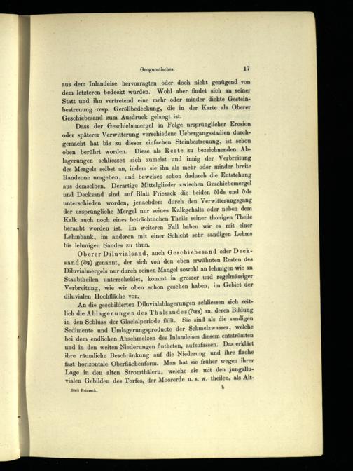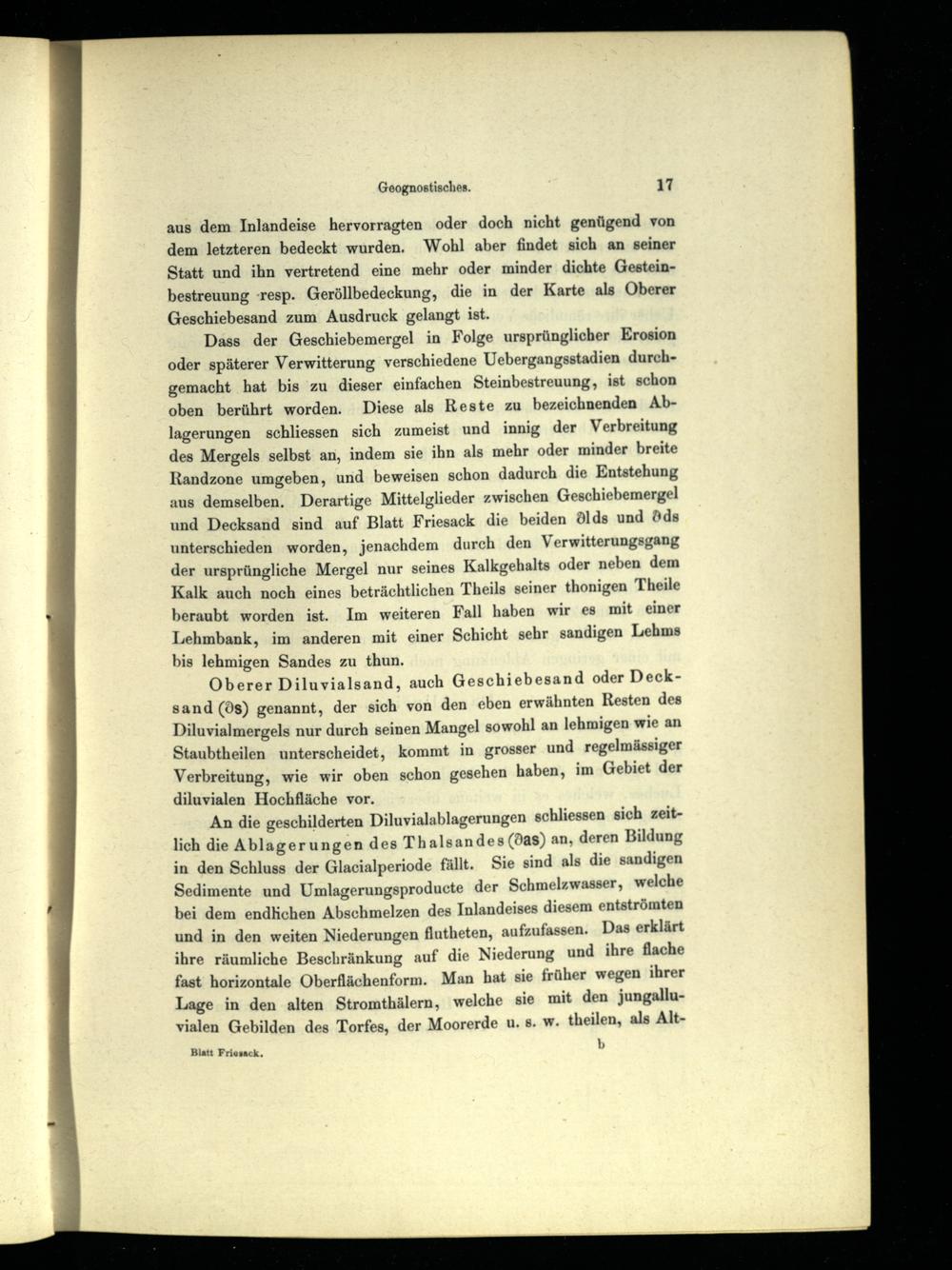 An die geschilderten Diluvialablagerungen schliessen sich zeitlich die Ablagerungen des Thalsandes(das) an, deren Bildung in den Schluss der Glacialperiode fällt. Sie sind als die sandigen Sedimente und Umlagerungsproducte der Schmelzwasser, welche bei dem endlichen Abschmelzen des Inlandeises diesem entströmten und in den weiten Niederungen flutheten, aufzufassen. Das erklärt ihre räumliche Beschränkung auf die Niederung und ihre flache fast horizontale Oberflächenform. Man hat sie früher wegen ihrer Lage in den alten Stromthälern, welche sie mit den jungalluvialen Gebilden des Torfes, der Moorerde u. 8. W. theilen, als Alt