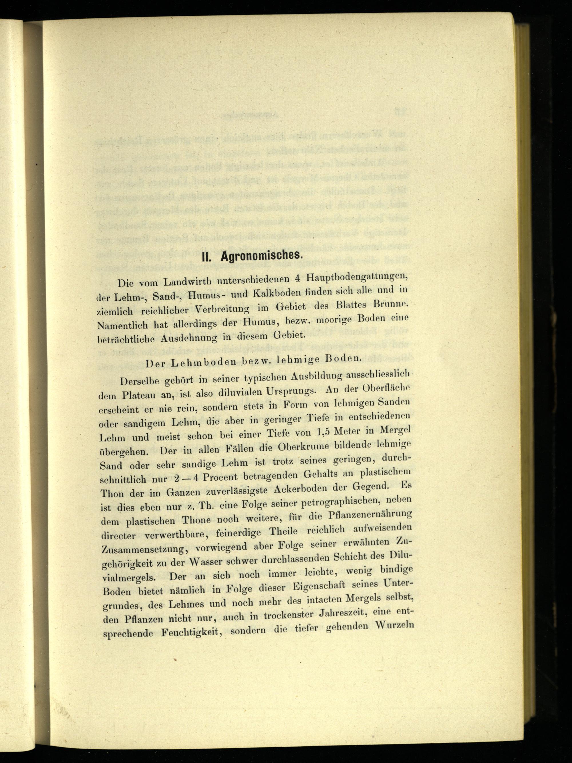dem Plateau an, ist also diluvialen Ursprungs. An der Oberfläche erscheint er nie rein, sondern stets in Form von lehmigen Sanden oder sandigem Lehm, die aber in geringer Tiefe in entschiedenen Lehm und meist schon bei einer Tiefe von 1,5 Meter in Mergel übergehen. Der in allen Fällen die Oberkrume bildende lehmige Sand oder sehr sandige Lehm ist trotz seines geringen, durchschnittlich nur 2— 4 Procent betragenden Gehalts an plastischem Thon der im Ganzen zuverlässigste Ackerboden der Gegend. Ks ist dies eben nur z. Th. eine Folge seiner petrographischen, neben dem. plastischen Thone noch weitere, für die Pflanzenernährung direeter verwerthbare, feinerdige Theile reichlich aufweisenden Zusammensetzung, vorwiegend aber Folge seiner erwähnten Zugehörigkeit zu der Wasser schwer durchlassenden Schicht des Diluvialmergels. Der an sich noch immer leichte, wenig bindige Boden bietet nämlich in Folge dieser Eigenschaft seines Untergrundes, des Lehmes und noch mehr des intacten Mergels selbst, den Pflanzen nicht nur, auch in trockenster Jahreszeit, eine entsprechende Feuchtigkeit, sondern die tiefer gehenden Wurzeln