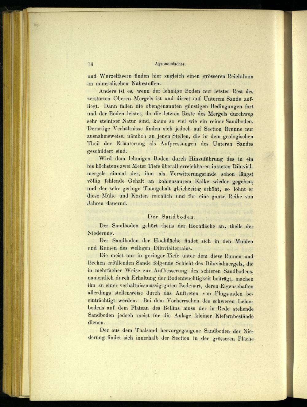 Anders ist es, wenn der lehmige Boden nur letzter Rest des zerstörten Oberen Mergels ist und direct auf Unterem Sande aufliegt. Dann fallen die obengenannten günstigen Bedingungen fort und der Boden leistet, da die letzten Reste des Mergels durchweg sehr steiniger Natur sind, kaum so viel wie ein reiner Sandboden. Derartige Verhältnisse finden sich jedoch auf Section Brunne nur ausnahmsweise, nämlich an jenen Stellen, die in dem geologischen Theil der Erläuterung als Aufpressungen des Unteren Sandes geschildert sind.;