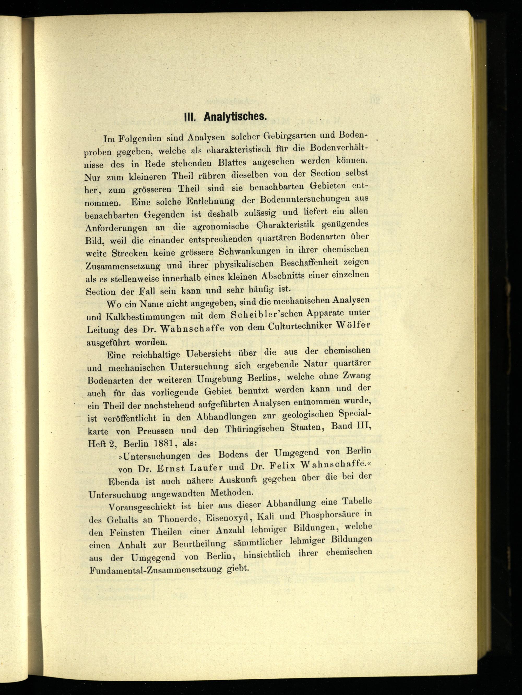 Eine reichhaltige Uebersicht über die aus der chemischen und mechanischen Untersuchung sich ergebende Natur quartärer Bodenarten der weiteren Umgebung Berlins, welche ohne Zwang auch für das vorliegende Gebiet benutzt werden kann und der ein Theil der nachstehend aufgeführten Analysen entnommen wurde, ist veröffentlicht in den Abhandlungen zur geologischen Specialkarte von Preussen und den Thüringischen Staaten, Band MI, Heft 2, Berlin 1881, als: