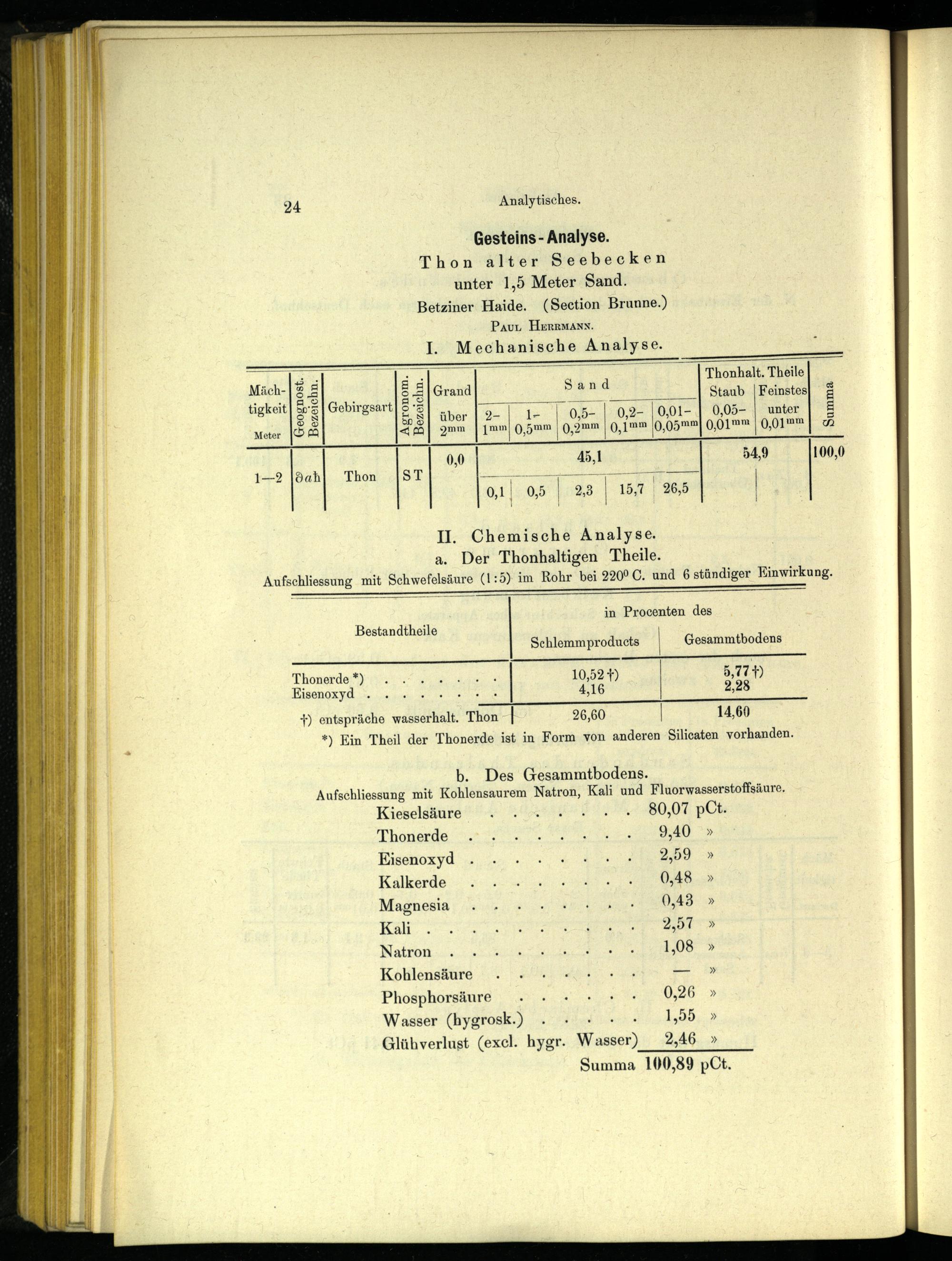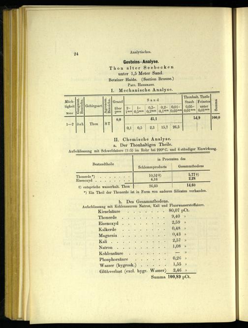 Gesteins- Analyse. Thon alter Seebecken unter 1,5 Meter Sand. Betziner Haide.(Section Brunne.) PaAur HErRMann.