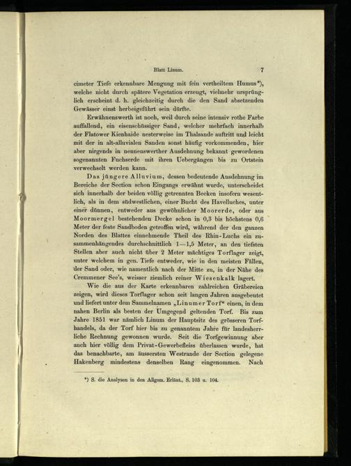 Das jüngere Alluvium, dessen bedeutende Ausdehnung im Bereiche der Section schon Eingangs erwähnt wurde, unterscheidet sich innerhalb der beiden völlig getrennten Becken insofern wesentlich, als in dem südwestlichen, einer Bucht des Havelluches, unter einer dünnen, entweder aus gewöhnlicher Moorerde, oder aus Moormergel bestehenden Decke schon in 0,3 bis höchstens 0,6 Meter der feste Sandboden getroffen wird, während der den ganzen Norden des Blattes einnehmende Theil des Rhin-Luchs ein zusammenhängendes durchschnittlich 1—1,5 Meter, an den tiefsten Stellen aber auch nicht über 2 Meter mächtiges Torflager zeigt, unter welchem in gen. Tiefe entweder, wie in den meisten Fällen, der Sand oder, wie namentlich nach der Mitte zu, in der Nähe des Cremmener See’s, weisser ziemlich reiner Wiesenkalk lagert.