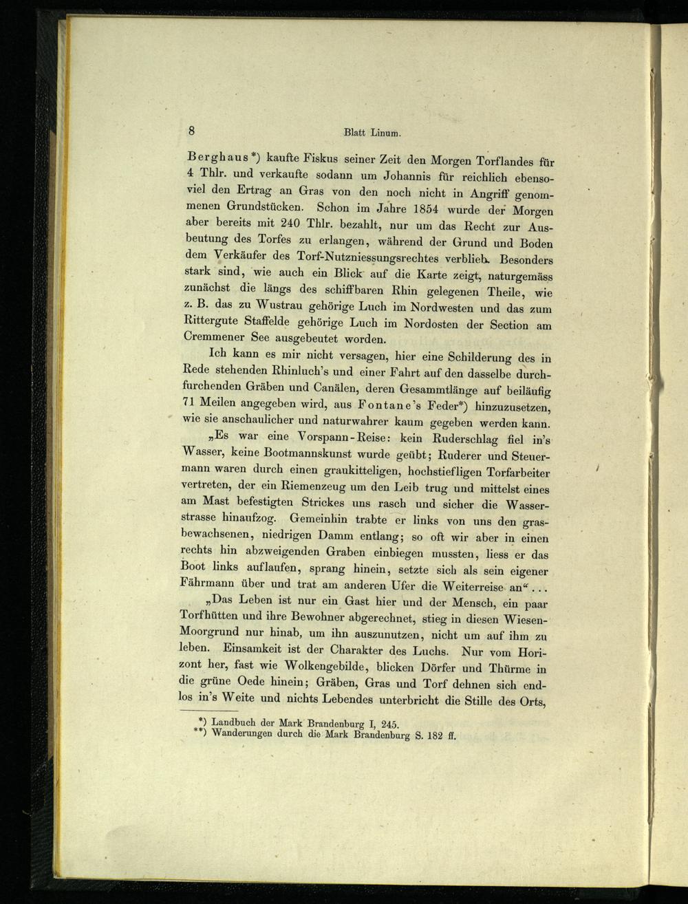 Ich kann es mir nicht versagen, hier eine Schilderung des in Rede stehenden Rhinluch’s und einer Fahrt auf den dasselbe durchfurchenden Gräben und Canälen, deren Gesammtlänge auf beiläufig 71 Meilen angegeben wird, aus Fontane’s Feder”) hinzuzusetzen, wie sie anschaulicher und naturwahrer kaum gegeben werden kann.