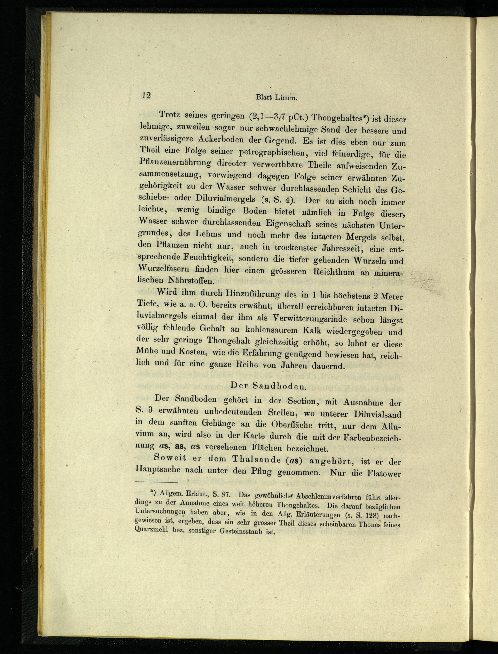 Trotz seines geringen(2,1—3,7 pCt.) Thongehaltes*) ist dieser lehmige, zuweilen sogar nur schwachlehmige Sand der bessere und zuverlässigere Ackerboden der Gegend. Es ist dies eben nur zum Theil eine Folge seiner petrographischen, viel feinerdige, für die Pflanzenernährung directer verwerthbare Theile aufweisenden Zusammensetzung, vorwiegend dagegen Folge seiner erwähnten Zugehörigkeit zu der Wasser schwer durchlassenden Schicht des Geschiebe- oder Diluvialmergels(s. S. 4). Der an sich noch immer leichte, wenig bindige Boden bietet nämlich in Folge dieser, Wasser schwer durchlassenden Eigenschaft seines nächsten Untergrundes, des Lehms und noch mehr des intacten Mergels selbst, den Pflanzen nicht nur, auch in trockenster Jahreszeit, eine entsprechende Feuchtigkeit, sondern die tiefer gehenden Wurzeln und Wurzelfasern ‚finden: hier einen grösseren Reichthum an mineralischen Nährstoffen.