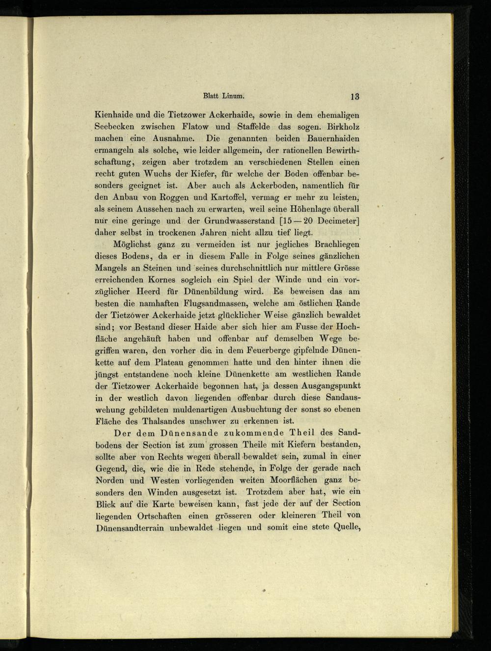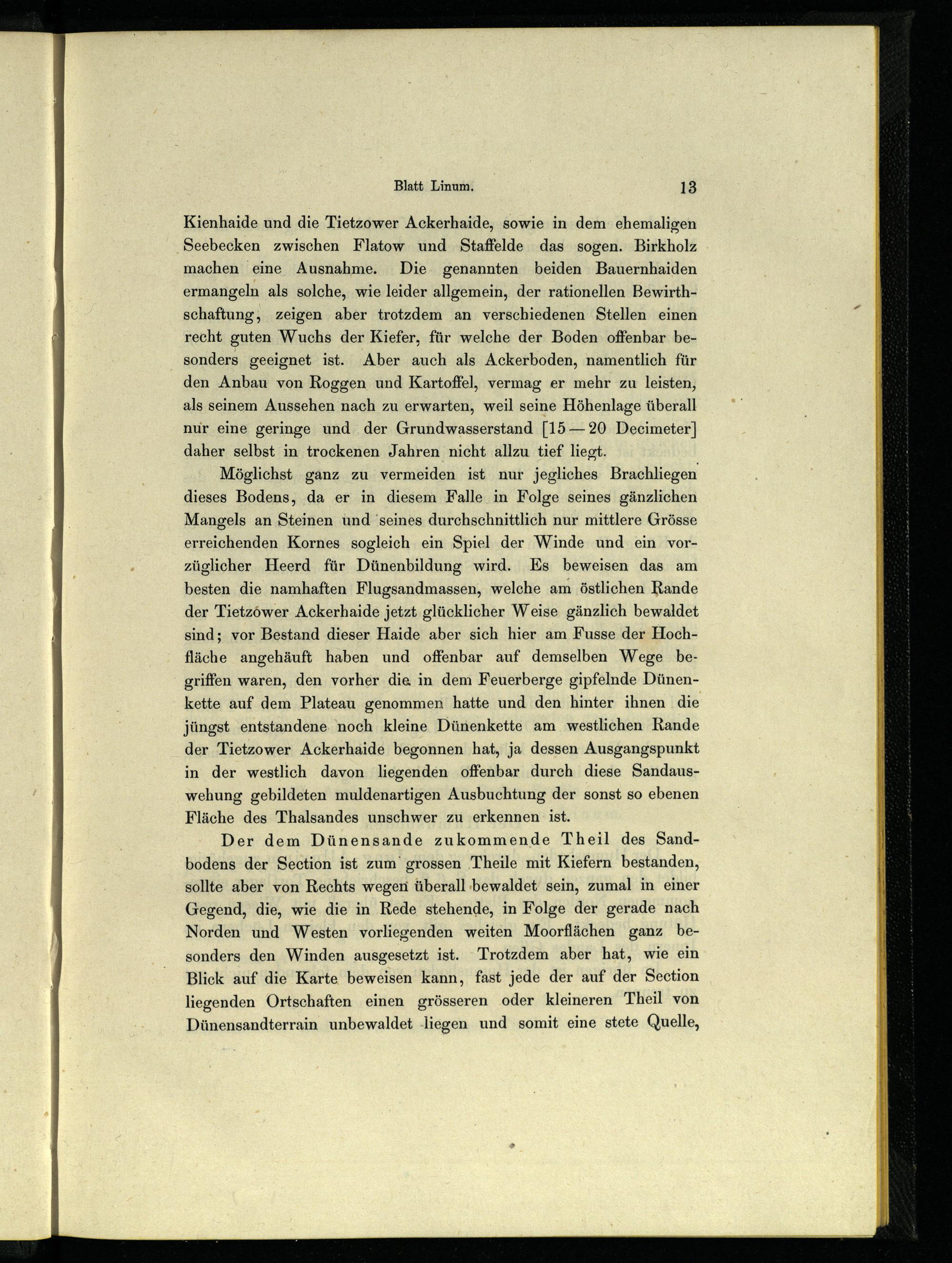 Möglichst ganz zu vermeiden ist nur jegliches Brachliegen dieses Bodens, da er in diesem Falle in Folge seines gänzlichen Mangels an Steinen und‘seines durchschnittlich nur mittlere Grösse erreichenden Kornes sogleich ein Spiel der Winde und ein vorzüglicher Heerd für Dünenbildung wird. Es beweisen das am besten die namhaften Flugsandmassen, welche am östlichen Rande der Tietzöwer Ackerhaide jetzt glücklicher Weise gänzlich bewaldet sind; vor Bestand dieser Haide aber sich hier am Fusse der Hochfläche angehäuft haben und offenbar auf demselben Wege begriffen waren, den vorher die in dem Feuerberge gipfelnde Dünenkette auf dem Plateau genommen hatte und den hinter ihnen die